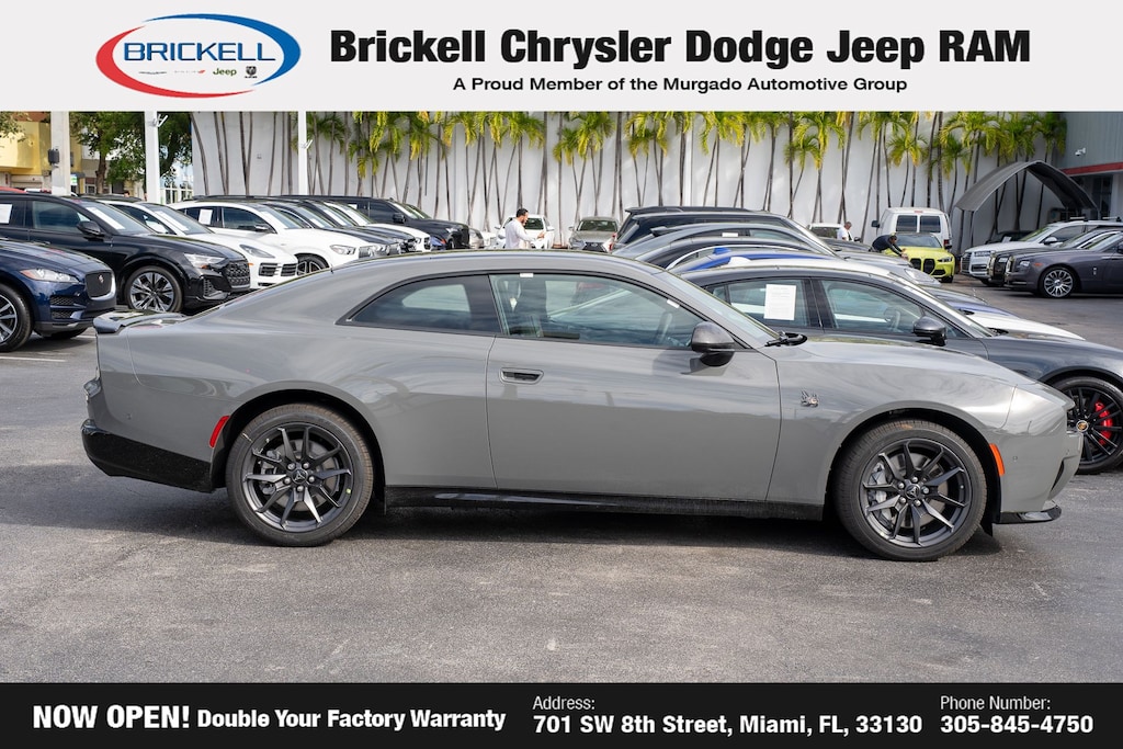 Discover Your Next Vehicle at Brickell Chrysler Dodge Jeep Ram Welcome to Brickell CDJR, where we go beyond selling cars. We double the factory powertrain warranty, giving you added peace of mind. Our dealership offers one of the largest new car inventories in the region, ensuring you find the right vehicle Prices displayed do not included our Perma-plate. Our state-of-the-art service department is the largest in the country and is open seven days a week from 7 AM to 9 PM. Visit us at 701 SW 8th St, Miami, FL 33130, or call 305-777-2800 to learn more and schedule a test drive. The displayed price includes an incentive for financing with Brickell CDJR Finance Company. Outside financing and bank drafts are not accepted. All pre-owned vehicle exports are subject to an export fee. Prices apply only to customers who live, work, or worship in Broward, Miami-Dade, Palm Beach, Monroe, Collier, Hendry, Lee, Glades, Martin, St. Lucie, Okeechobee, Manatee, Hillsborough, Osceola, or Orange County. Customers outside these counties will pay an additional $ Taxes, title, registration, and dealer fees apply. Factory MSRP: $70,455 Destroyer Gray 2026 Dodge Charger R/T Scat Pack AWD 8-Speed Automatic HO AWD, Black Artificial Leather.