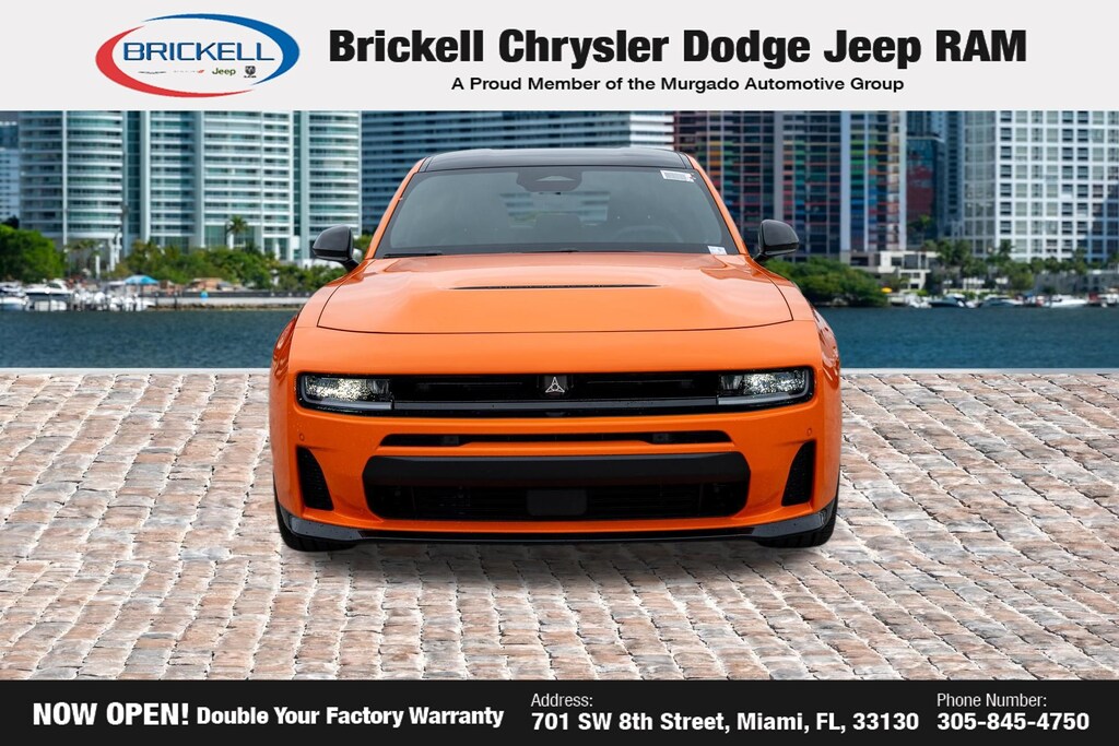 Price includes: $1500 - 2026 National Burning Gas Conquest Bonus Cash. Exp. 04/30/2026 $500 - 2026 National 2026 First Responder Bonus Cash . Exp. 01/04/2027 Discover Your Next Vehicle at Brickell Chrysler Dodge Jeep Ram Welcome to Brickell CDJR, where we go beyond selling cars. We double the factory powertrain warranty, giving you added peace of mind. Our dealership offers one of the largest new car inventories in the region, ensuring you find the right vehicle Prices displayed do not included our Perma-plate. Our state-of-the-art service department is the largest in the country and is open seven days a week from 7 AM to 9 PM. Visit us at 701 SW 8th St, Miami, FL 33130, or call 305-777-2800 to learn more and schedule a test drive. The displayed price includes an incentive for financing with Brickell CDJR Finance Company. Outside financing and bank drafts are not accepted. All pre-owned vehicle exports are subject to an export fee. Prices apply only to customers who live, work, or worship in Broward, Miami-Dade, Palm Beach, Monroe, Collier, Hendry, Lee, Glades, Martin, St. Lucie, Okeechobee, Manatee, Hillsborough, Osceola, or Orange County. Customers outside these counties will pay an additional $ Taxes, title, registration, and dealer fees apply. Factory MSRP: $60,275 Header Orange Clearcoat 2026 Dodge Charger R/T Scat Pack AWD 8-Speed Automatic HO AWD, Black Cloth.