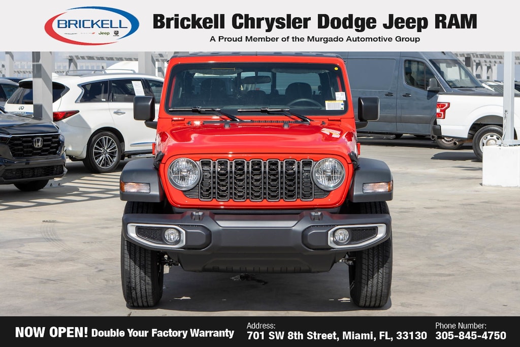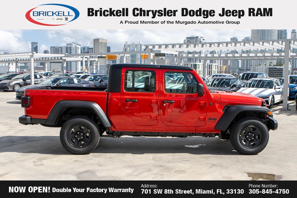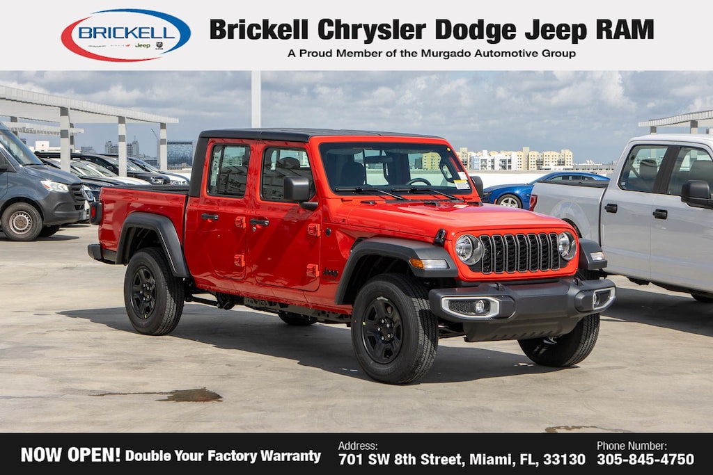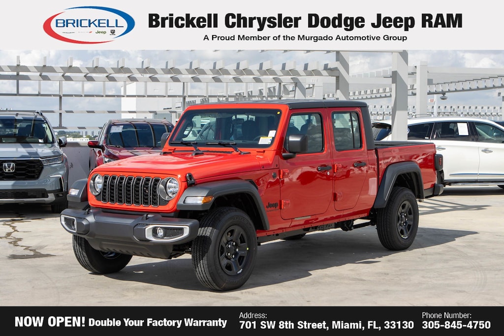 Price includes: $500 - 2025 National 2025 First Responder Bonus Cash. Exp. 01/05/2026 $500 - 2025 National 2025 Military Bonus Cash. Exp. 01/05/2026 Discover Your Next Vehicle at Brickell Chrysler Dodge Jeep Ram Welcome to Brickell CDJR, where we go beyond selling cars. We double the factory powertrain warranty, giving you added peace of mind. Our dealership offers one of the largest new car inventories in the region, ensuring you find the right vehicle Prices displayed do not included our Perma-plate. Our state-of-the-art service department is the largest in the country and is open seven days a week from 7 AM to 9 PM. Visit us at 701 SW 8th St, Miami, FL 33130, or call 305-777-2800 to learn more and schedule a test drive. The displayed price includes an incentive for financing with Brickell CDJR Finance Company. Outside financing and bank drafts are not accepted. All pre-owned vehicle exports are subject to an export fee. Prices apply only to customers who live, work, or worship in Broward, Miami-Dade, Palm Beach, Monroe, Collier, Hendry, Lee, Glades, Martin, St. Lucie, Okeechobee, Manatee, Hillsborough, Osceola, or Orange County. Customers outside these counties will pay an additional $ Taxes, title, registration, and dealer fees apply. Factory MSRP: $43,110 Firecracker Red Clearcoat 2025 Jeep Gladiator Sport 4WD 8-Speed Automatic 3.6L V6 24V VVT