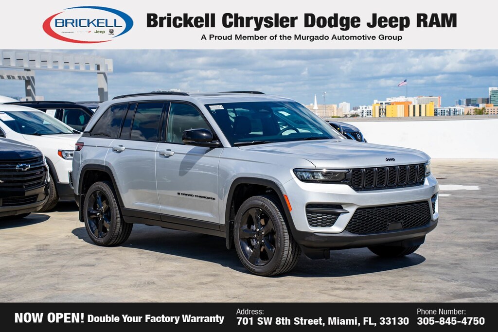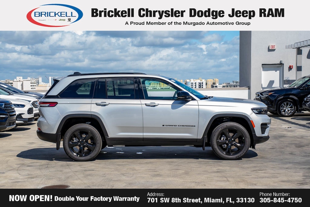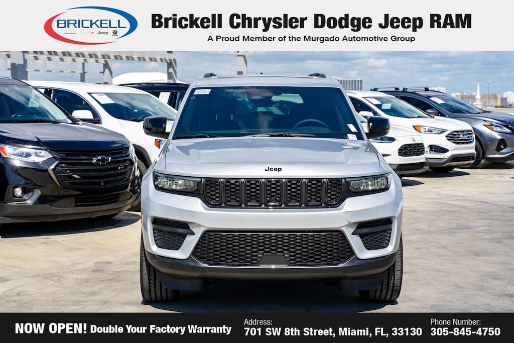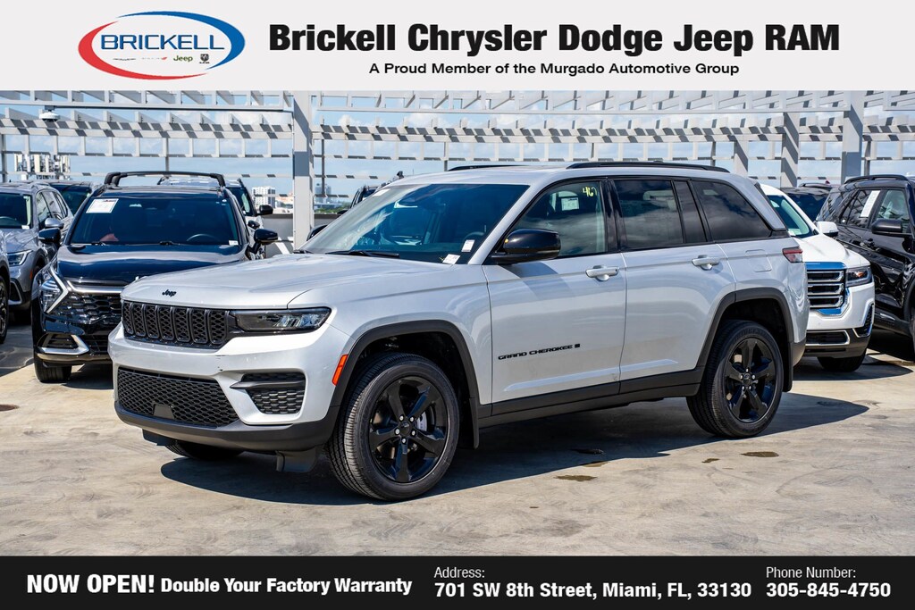 Price includes: $1000 - 2025 National Grand Cherokee Loyalty Retail Bonus Cash . Exp. 11/03/2025 $500 - 2025 National 2025 First Responder Bonus Cash. Exp. 01/05/2026 $500 - 2025 National 2025 Military Bonus Cash. Exp. 01/05/2026 Discover Your Next Vehicle at Brickell Chrysler Dodge Jeep Ram Welcome to Brickell CDJR, where we go beyond selling cars. We double the factory powertrain warranty, giving you added peace of mind. Our dealership offers one of the largest new car inventories in the region, ensuring you find the right vehicle Prices displayed do not included our Perma-plate. Our state-of-the-art service department is the largest in the country and is open seven days a week from 7 AM to 9 PM. Visit us at 701 SW 8th St, Miami, FL 33130, or call 305-777-2800 to learn more and schedule a test drive. The displayed price includes an incentive for financing with Brickell CDJR Finance Company. Outside financing and bank drafts are not accepted. All pre-owned vehicle exports are subject to an export fee. Prices apply only to customers who live, work, or worship in Broward, Miami-Dade, Palm Beach, Monroe, Collier, Hendry, Lee, Glades, Martin, St. Lucie, Okeechobee, Manatee, Hillsborough, Osceola, or Orange County. Customers outside these counties will pay an additional $ Taxes, title, registration, and dealer fees apply. Factory MSRP: $48,800 Silver Zynith 2025 Jeep Grand Cherokee Altitude X 4WD 8-Speed Automatic 3.6L V6 24V VVT 4WD.