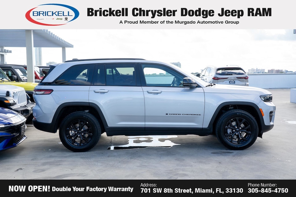 Price includes: $1500 - 2025 National Stellantis Loyalty Retail Bonus Cash . Exp. 02/02/2026 $2250 - 2025 National Retail Bonus Cash . Exp. 02/02/2026 $500 - 2025 National 2025 First Responder Bonus Cash. Exp. 01/04/2027 $500 - 2025 National 2025 Military Bonus Cash. Exp. 01/04/2027 $500 - 2025 South BC Retail Bonus Cash . Exp. 01/20/2026 Discover Your Next Vehicle at Brickell Chrysler Dodge Jeep Ram Welcome to Brickell CDJR, where we go beyond selling cars. We double the factory powertrain warranty, giving you added peace of mind. Our dealership offers one of the largest new car inventories in the region, ensuring you find the right vehicle Prices displayed do not included our Perma-plate. Our state-of-the-art service department is the largest in the country and is open seven days a week from 7 AM to 9 PM. Visit us at 701 SW 8th St, Miami, FL 33130, or call 305-777-2800 to learn more and schedule a test drive. The displayed price includes an incentive for financing with Brickell CDJR Finance Company. Outside financing and bank drafts are not accepted. All pre-owned vehicle exports are subject to an export fee. Prices apply only to customers who live, work, or worship in Broward, Miami-Dade, Palm Beach, Monroe, Collier, Hendry, Lee, Glades, Martin, St. Lucie, Okeechobee, Manatee, Hillsborough, Osceola, or Orange County. Customers outside these counties will pay an additional $ Taxes, title, registration, and dealer fees apply. Factory MSRP: $45,725 Silver Zynith 2025 Jeep Grand Cherokee Altitude X RWD 8-Speed Automatic 3.6L V6 24V VVT