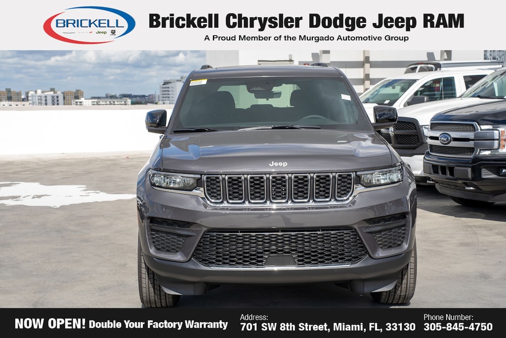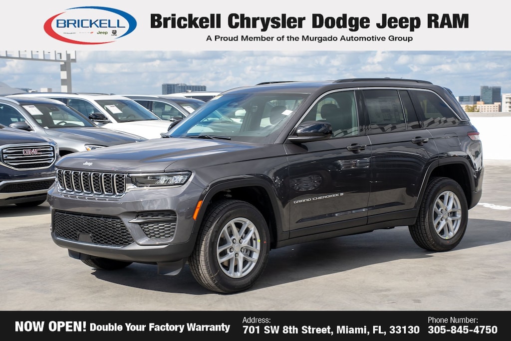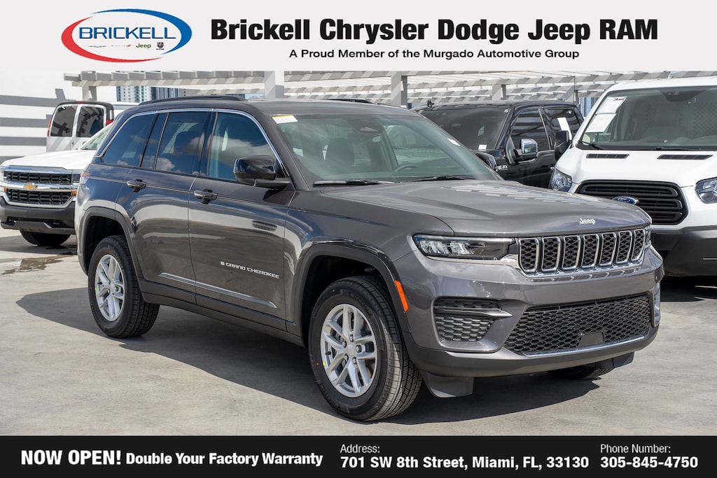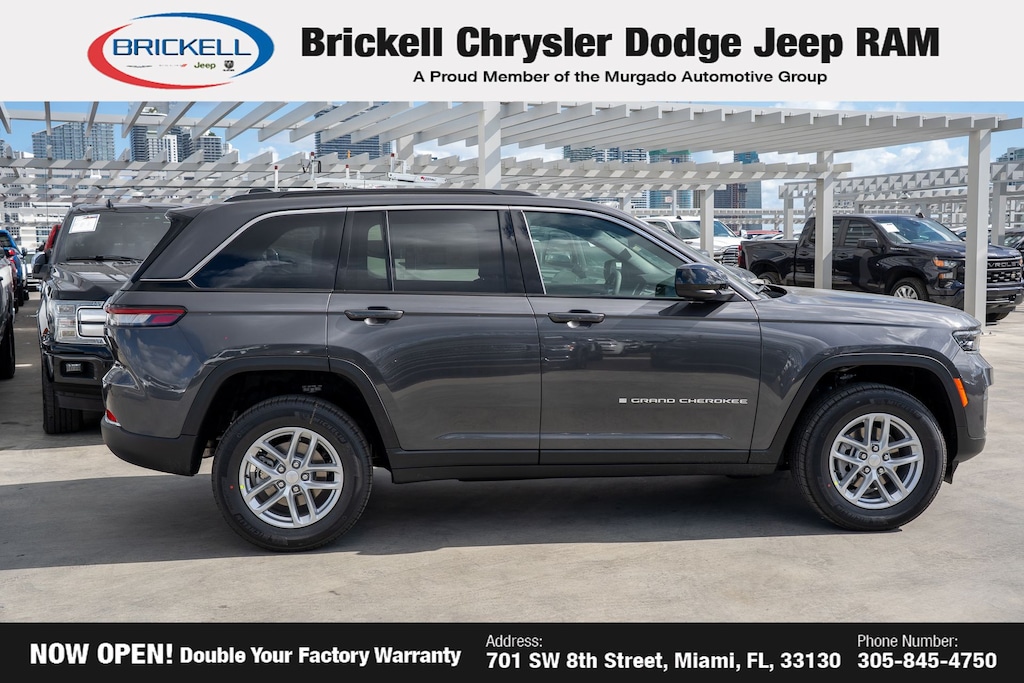 Price includes: $1500 - 2025 National Stellantis Loyalty Retail Bonus Cash . Exp. 02/02/2026 $2250 - 2025 National Retail Bonus Cash . Exp. 02/02/2026 $500 - 2025 National 2025 First Responder Bonus Cash. Exp. 01/04/2027 $500 - 2025 National 2025 Military Bonus Cash. Exp. 01/04/2027 $500 - 2025 South BC Retail Bonus Cash . Exp. 01/20/2026 Discover Your Next Vehicle at Brickell Chrysler Dodge Jeep Ram Welcome to Brickell CDJR, where we go beyond selling cars. We double the factory powertrain warranty, giving you added peace of mind. Our dealership offers one of the largest new car inventories in the region, ensuring you find the right vehicle Prices displayed do not included our Perma-plate. Our state-of-the-art service department is the largest in the country and is open seven days a week from 7 AM to 9 PM. Visit us at 701 SW 8th St, Miami, FL 33130, or call 305-777-2800 to learn more and schedule a test drive. The displayed price includes an incentive for financing with Brickell CDJR Finance Company. Outside financing and bank drafts are not accepted. All pre-owned vehicle exports are subject to an export fee. Prices apply only to customers who live, work, or worship in Broward, Miami-Dade, Palm Beach, Monroe, Collier, Hendry, Lee, Glades, Martin, St. Lucie, Okeechobee, Manatee, Hillsborough, Osceola, or Orange County. Customers outside these counties will pay an additional $ Taxes, title, registration, and dealer fees apply. Factory MSRP: $40,975 Baltic Gray Metallic Clearcoat 2025 Jeep Grand Cherokee Laredo X RWD 8-Speed Automatic 3.6L V6 24V VVT