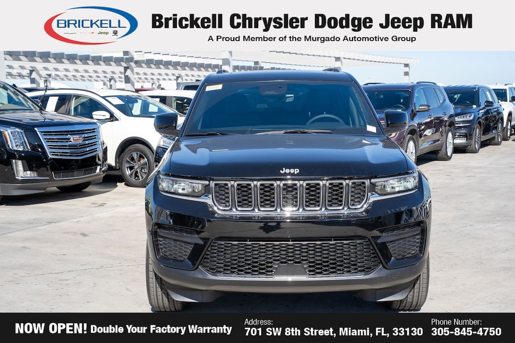 Price includes: $1500 - 2025 National Stellantis Loyalty Retail Bonus Cash . Exp. 02/02/2026 $2250 - 2025 National Retail Bonus Cash . Exp. 02/02/2026 $500 - 2025 National 2025 First Responder Bonus Cash. Exp. 01/04/2027 $500 - 2025 National 2025 Military Bonus Cash. Exp. 01/04/2027 $500 - 2025 Southeast BC Retail Bonus Cash . Exp. 02/02/2026 Discover Your Next Vehicle at Brickell Chrysler Dodge Jeep Ram Welcome to Brickell CDJR, where we go beyond selling cars. We double the factory powertrain warranty, giving you added peace of mind. Our dealership offers one of the largest new car inventories in the region, ensuring you find the right vehicle Prices displayed do not included our Perma-plate. Our state-of-the-art service department is the largest in the country and is open seven days a week from 7 AM to 9 PM. Visit us at 701 SW 8th St, Miami, FL 33130, or call 305-777-2800 to learn more and schedule a test drive. The displayed price includes an incentive for financing with Brickell CDJR Finance Company. Outside financing and bank drafts are not accepted. All pre-owned vehicle exports are subject to an export fee. Prices apply only to customers who live, work, or worship in Broward, Miami-Dade, Palm Beach, Monroe, Collier, Hendry, Lee, Glades, Martin, St. Lucie, Okeechobee, Manatee, Hillsborough, Osceola, or Orange County. Customers outside these counties will pay an additional $ Taxes, title, registration, and dealer fees apply. Factory MSRP: $40,975 Diamond Black Crystal Pearlcoat 2025 Jeep Grand Cherokee Laredo X RWD 8-Speed Automatic 3.6L V6 24V VVT
