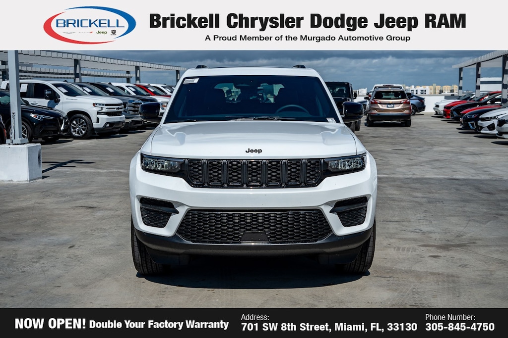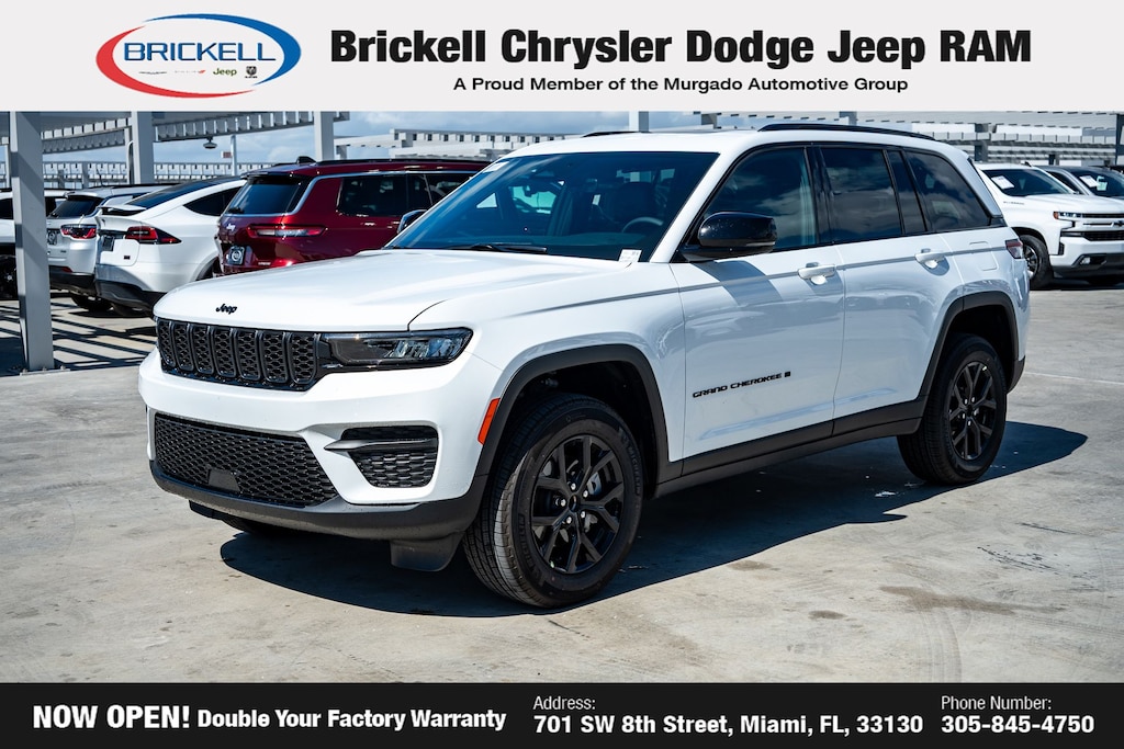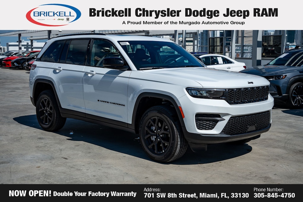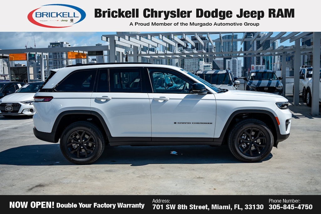 Price includes: $1500 - 2025 Southeast BC Retail Bonus Cash . Exp. 03/31/2026 $2000 - 2025 National Bonus Cash . Exp. 03/31/2026 $2250 - 2025 National Retail Bonus Cash . Exp. 03/31/2026 $500 - 2025 National 2025 First Responder Bonus Cash. Exp. 01/04/2027 $500 - 2025 National 2025 Military Bonus Cash. Exp. 01/04/2027 Discover Your Next Vehicle at Brickell Chrysler Dodge Jeep Ram Welcome to Brickell CDJR, where we go beyond selling cars. We double the factory powertrain warranty, giving you added peace of mind. Our dealership offers one of the largest new car inventories in the region, ensuring you find the right vehicle Prices displayed do not included our Perma-plate. Our state-of-the-art service department is the largest in the country and is open seven days a week from 7 AM to 9 PM. Visit us at 701 SW 8th St, Miami, FL 33130, or call 305-777-2800 to learn more and schedule a test drive. The displayed price includes an incentive for financing with Brickell CDJR Finance Company. Outside financing and bank drafts are not accepted. All pre-owned vehicle exports are subject to an export fee. Prices apply only to customers who live, work, or worship in Broward, Miami-Dade, Palm Beach, Monroe, Collier, Hendry, Lee, Glades, Martin, St. Lucie, Okeechobee, Manatee, Hillsborough, Osceola, or Orange County. Customers outside these counties will pay an additional $ Taxes, title, registration, and dealer fees apply. Factory MSRP: $44,735 Bright White Clearcoat 2025 Jeep Grand Cherokee Altitude X RWD 8-Speed Automatic 3.6L V6 24V VVT