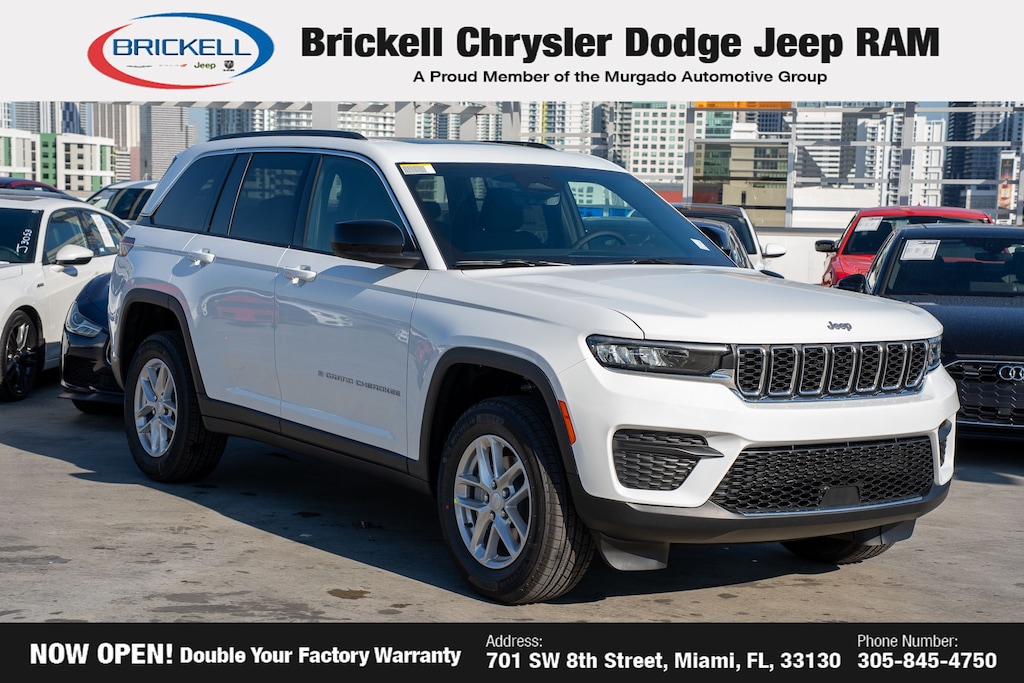 Price includes: $1500 - 2025 National Stellantis Loyalty Retail Bonus Cash . Exp. 02/02/2026 $2250 - 2025 National Retail Bonus Cash . Exp. 02/02/2026 $500 - 2025 National 2025 First Responder Bonus Cash. Exp. 01/04/2027 $500 - 2025 National 2025 Military Bonus Cash. Exp. 01/04/2027 $500 - 2025 South BC Retail Bonus Cash . Exp. 01/20/2026 Discover Your Next Vehicle at Brickell Chrysler Dodge Jeep Ram Welcome to Brickell CDJR, where we go beyond selling cars. We double the factory powertrain warranty, giving you added peace of mind. Our dealership offers one of the largest new car inventories in the region, ensuring you find the right vehicle Prices displayed do not included our Perma-plate. Our state-of-the-art service department is the largest in the country and is open seven days a week from 7 AM to 9 PM. Visit us at 701 SW 8th St, Miami, FL 33130, or call 305-777-2800 to learn more and schedule a test drive. The displayed price includes an incentive for financing with Brickell CDJR Finance Company. Outside financing and bank drafts are not accepted. All pre-owned vehicle exports are subject to an export fee. Prices apply only to customers who live, work, or worship in Broward, Miami-Dade, Palm Beach, Monroe, Collier, Hendry, Lee, Glades, Martin, St. Lucie, Okeechobee, Manatee, Hillsborough, Osceola, or Orange County. Customers outside these counties will pay an additional $ Taxes, title, registration, and dealer fees apply. Factory MSRP: $42,175 Bright White Clearcoat 2025 Jeep Grand Cherokee Laredo X RWD 8-Speed Automatic 3.6L V6 24V VVT