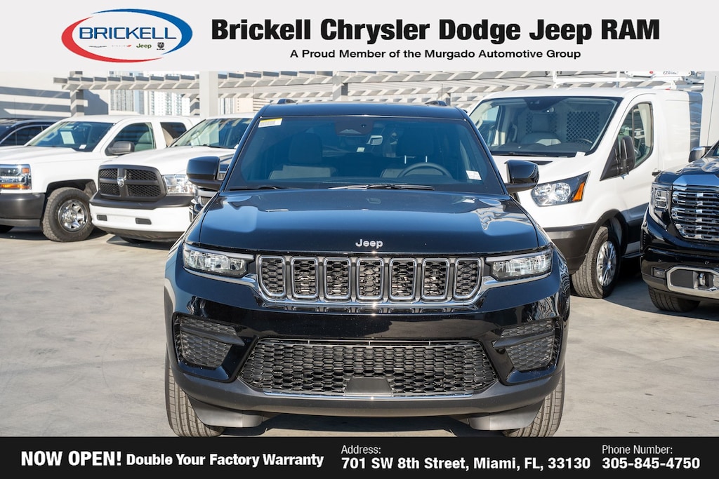 Price includes: $1500 - 2025 National Stellantis Loyalty Retail Bonus Cash . Exp. 02/02/2026 $2250 - 2025 National Retail Bonus Cash . Exp. 02/02/2026 $500 - 2025 National 2025 First Responder Bonus Cash. Exp. 01/04/2027 $500 - 2025 National 2025 Military Bonus Cash. Exp. 01/04/2027 $500 - 2025 South BC Retail Bonus Cash . Exp. 01/20/2026 Discover Your Next Vehicle at Brickell Chrysler Dodge Jeep Ram Welcome to Brickell CDJR, where we go beyond selling cars. We double the factory powertrain warranty, giving you added peace of mind. Our dealership offers one of the largest new car inventories in the region, ensuring you find the right vehicle Prices displayed do not included our Perma-plate. Our state-of-the-art service department is the largest in the country and is open seven days a week from 7 AM to 9 PM. Visit us at 701 SW 8th St, Miami, FL 33130, or call 305-777-2800 to learn more and schedule a test drive. The displayed price includes an incentive for financing with Brickell CDJR Finance Company. Outside financing and bank drafts are not accepted. All pre-owned vehicle exports are subject to an export fee. Prices apply only to customers who live, work, or worship in Broward, Miami-Dade, Palm Beach, Monroe, Collier, Hendry, Lee, Glades, Martin, St. Lucie, Okeechobee, Manatee, Hillsborough, Osceola, or Orange County. Customers outside these counties will pay an additional $ Taxes, title, registration, and dealer fees apply. Factory MSRP: $40,975 Diamond Black Crystal Pearlcoat 2025 Jeep Grand Cherokee Laredo X RWD 8-Speed Automatic 3.6L V6 24V VVT