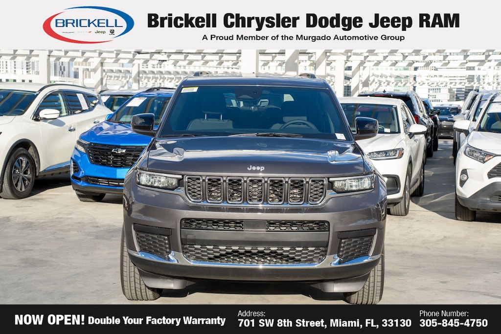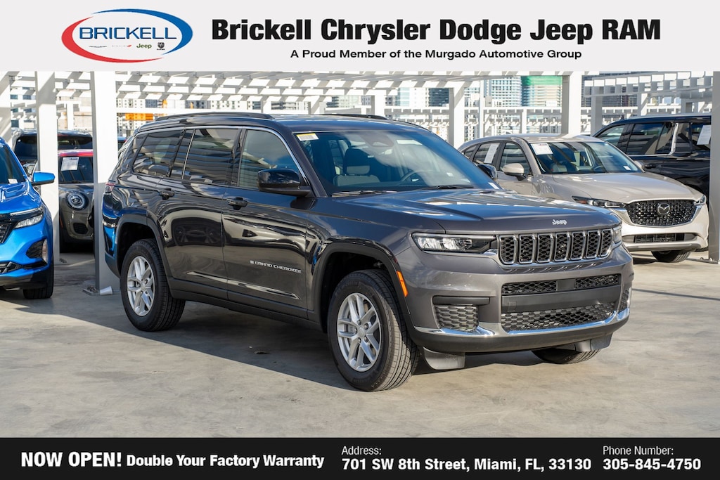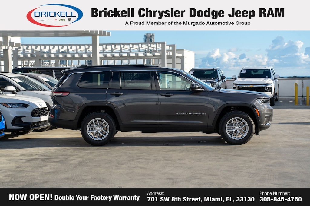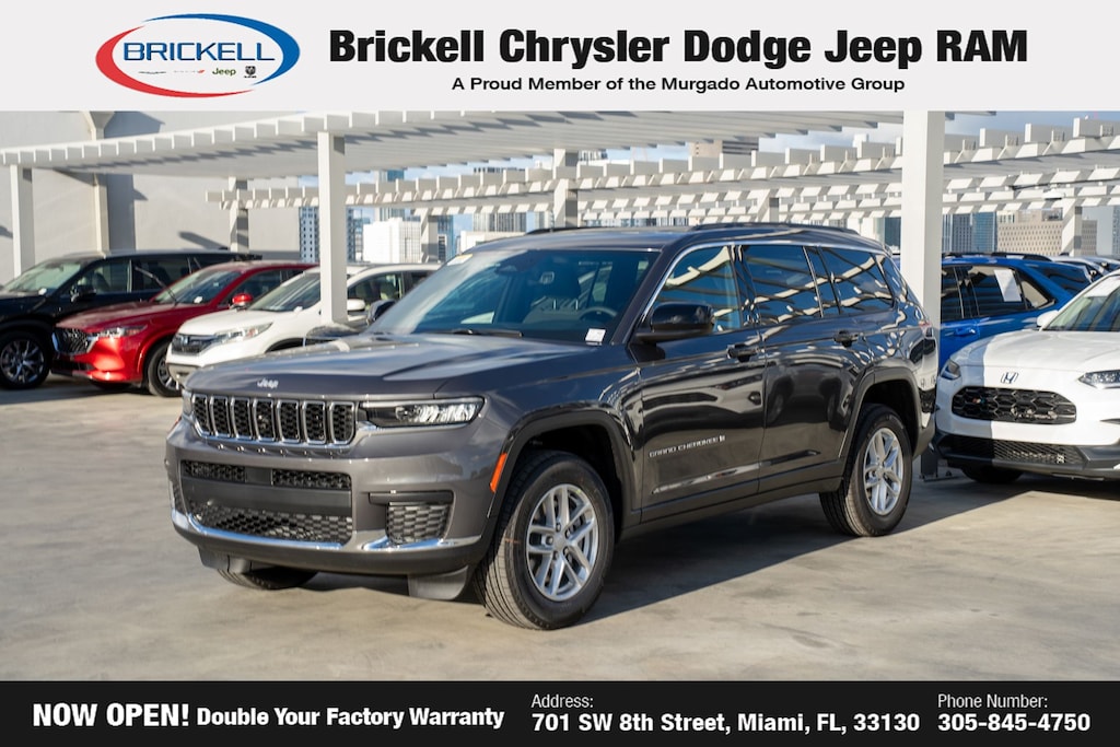 Price includes: $1000 - 2025 National Grand Cherokee Loyalty Retail Bonus Cash . Exp. 12/01/2025 $500 - 2025 National 2025 First Responder Bonus Cash. Exp. 01/05/2026 $500 - 2025 National 2025 Military Bonus Cash. Exp. 01/05/2026 $500 - 2025 South BC Retail Bonus Cash . Exp. 12/01/2025 Discover Your Next Vehicle at Brickell Chrysler Dodge Jeep Ram Welcome to Brickell CDJR, where we go beyond selling cars. We double the factory powertrain warranty, giving you added peace of mind. Our dealership offers one of the largest new car inventories in the region, ensuring you find the right vehicle Prices displayed do not included our Perma-plate. Our state-of-the-art service department is the largest in the country and is open seven days a week from 7 AM to 9 PM. Visit us at 701 SW 8th St, Miami, FL 33130, or call 305-777-2800 to learn more and schedule a test drive. The displayed price includes an incentive for financing with Brickell CDJR Finance Company. Outside financing and bank drafts are not accepted. All pre-owned vehicle exports are subject to an export fee. Prices apply only to customers who live, work, or worship in Broward, Miami-Dade, Palm Beach, Monroe, Collier, Hendry, Lee, Glades, Martin, St. Lucie, Okeechobee, Manatee, Hillsborough, Osceola, or Orange County. Customers outside these counties will pay an additional $ Taxes, title, registration, and dealer fees apply. Factory MSRP: $42,125 Baltic Gray Metallic Clearcoat 2025 Jeep Grand Cherokee L Laredo RWD 8-Speed Automatic 3.6L V6 24V VVT