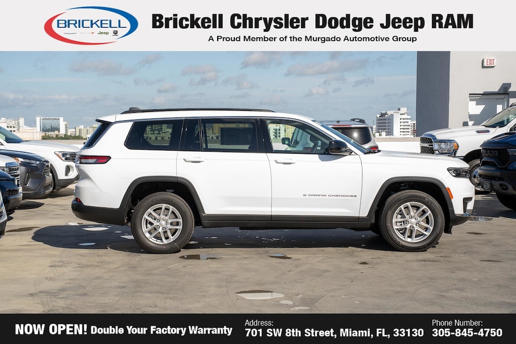 Price includes: $1500 - 2025 National Stellantis Loyalty Retail Bonus Cash . Exp. 01/05/2026 $2000 - 2025 National Holiday Select Inventory Bonus Cash. Exp. 01/05/2026 $2500 - 2025 National Retail Bonus Cash . Exp. 01/05/2026 $500 - 2025 National 2025 First Responder Bonus Cash. Exp. 01/05/2026 $500 - 2025 National 2025 Military Bonus Cash. Exp. 01/05/2026 $500 - 2025 South BC Retail Bonus Cash . Exp. 01/05/2026 $1,500 - Exp. 12/30/2025 Discover Your Next Vehicle at Brickell Chrysler Dodge Jeep Ram Welcome to Brickell CDJR, where we go beyond selling cars. We double the factory powertrain warranty, giving you added peace of mind. Our dealership offers one of the largest new car inventories in the region, ensuring you find the right vehicle Prices displayed do not included our Perma-plate. Our state-of-the-art service department is the largest in the country and is open seven days a week from 7 AM to 9 PM. Visit us at 701 SW 8th St, Miami, FL 33130, or call 305-777-2800 to learn more and schedule a test drive. The displayed price includes an incentive for financing with Brickell CDJR Finance Company. Outside financing and bank drafts are not accepted. All pre-owned vehicle exports are subject to an export fee. Prices apply only to customers who live, work, or worship in Broward, Miami-Dade, Palm Beach, Monroe, Collier, Hendry, Lee, Glades, Martin, St. Lucie, Okeechobee, Manatee, Hillsborough, Osceola, or Orange County. Customers outside these counties will pay an additional $ Taxes, title, registration, and dealer fees apply. Factory MSRP: $43,530 Bright White Clearcoat 2025 Jeep Grand Cherokee L Laredo 4WD 8-Speed Automatic 3.6L V6 24V VVT