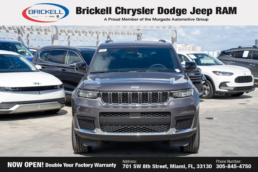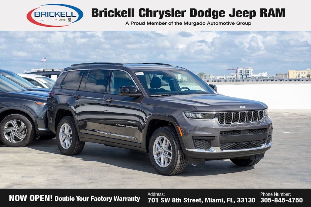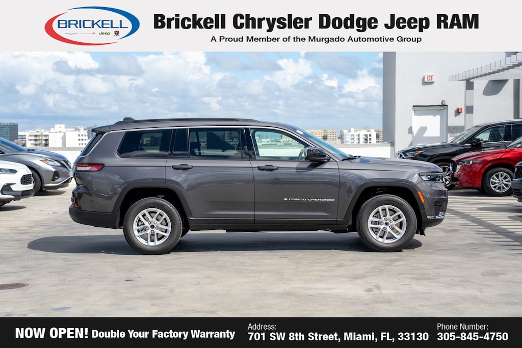 Price includes: $1000 - 2025 National Grand Cherokee Loyalty Retail Bonus Cash . Exp. 11/03/2025 $500 - 2025 National 2025 First Responder Bonus Cash. Exp. 01/05/2026 $500 - 2025 National 2025 Military Bonus Cash. Exp. 01/05/2026 Discover Your Next Vehicle at Brickell Chrysler Dodge Jeep Ram Welcome to Brickell CDJR, where we go beyond selling cars. We double the factory powertrain warranty, giving you added peace of mind. Our dealership offers one of the largest new car inventories in the region, ensuring you find the right vehicle Prices displayed do not included our Perma-plate. Our state-of-the-art service department is the largest in the country and is open seven days a week from 7 AM to 9 PM. Visit us at 701 SW 8th St, Miami, FL 33130, or call 305-777-2800 to learn more and schedule a test drive. The displayed price includes an incentive for financing with Brickell CDJR Finance Company. Outside financing and bank drafts are not accepted. All pre-owned vehicle exports are subject to an export fee. Prices apply only to customers who live, work, or worship in Broward, Miami-Dade, Palm Beach, Monroe, Collier, Hendry, Lee, Glades, Martin, St. Lucie, Okeechobee, Manatee, Hillsborough, Osceola, or Orange County. Customers outside these counties will pay an additional $ Taxes, title, registration, and dealer fees apply. Factory MSRP: $42,125 Baltic Gray Metallic Clearcoat 2025 Jeep Grand Cherokee L Laredo RWD 8-Speed Automatic 3.6L V6 24V VVT