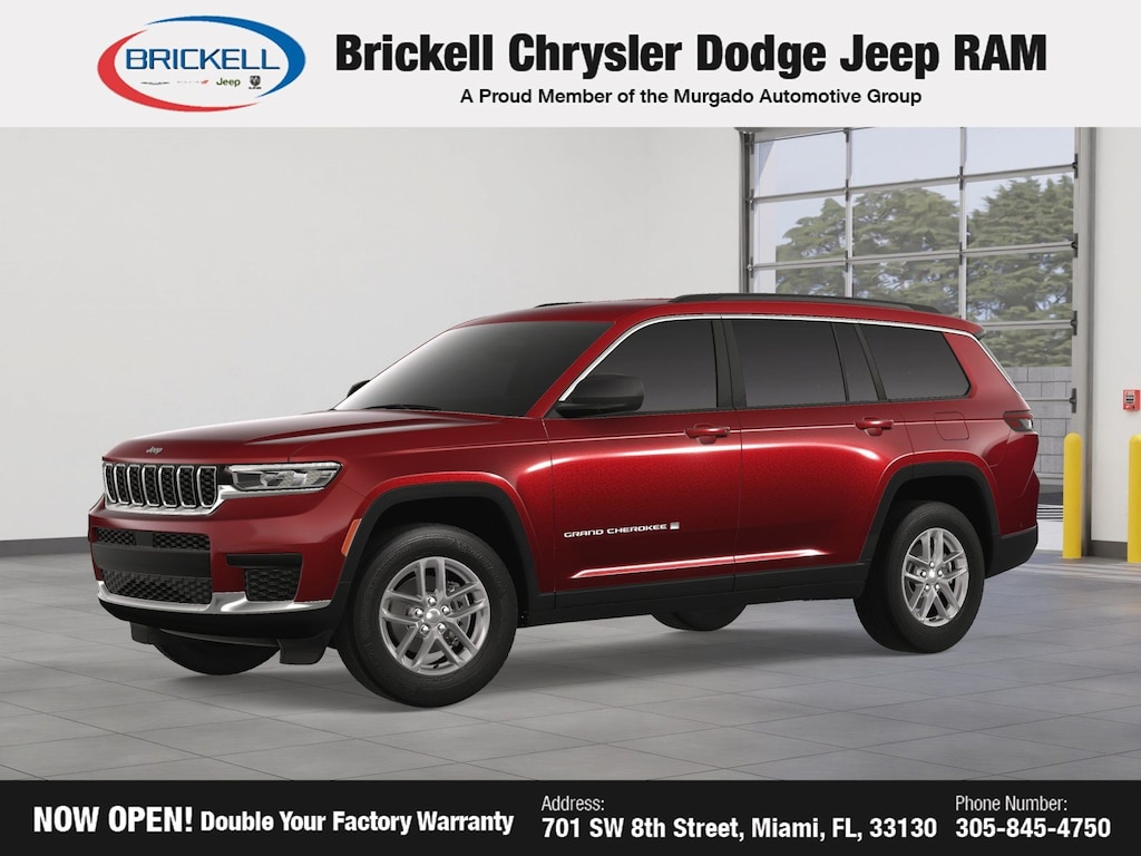 Price includes: $1000 - 2025 National Grand Cherokee Loyalty Retail Bonus Cash . Exp. 11/03/2025 $500 - 2025 National 2025 First Responder Bonus Cash. Exp. 01/05/2026 $500 - 2025 National 2025 Military Bonus Cash. Exp. 01/05/2026 Discover Your Next Vehicle at Brickell Chrysler Dodge Jeep Ram Welcome to Brickell CDJR, where we go beyond selling cars. We double the factory powertrain warranty, giving you added peace of mind. Our dealership offers one of the largest new car inventories in the region, ensuring you find the right vehicle Prices displayed do not included our Perma-plate. Our state-of-the-art service department is the largest in the country and is open seven days a week from 7 AM to 9 PM. Visit us at 701 SW 8th St, Miami, FL 33130, or call 305-777-2800 to learn more and schedule a test drive. The displayed price includes an incentive for financing with Brickell CDJR Finance Company. Outside financing and bank drafts are not accepted. All pre-owned vehicle exports are subject to an export fee. Prices apply only to customers who live, work, or worship in Broward, Miami-Dade, Palm Beach, Monroe, Collier, Hendry, Lee, Glades, Martin, St. Lucie, Okeechobee, Manatee, Hillsborough, Osceola, or Orange County. Customers outside these counties will pay an additional $ Taxes, title, registration, and dealer fees apply. New Price! Factory MSRP: $41,625 Velvet Red Pearlcoat 2025 Jeep Grand Cherokee L Laredo RWD 8-Speed Automatic 3.6L V6 24V VVT