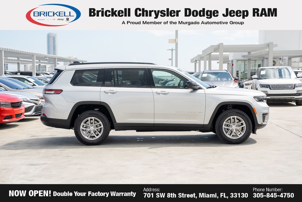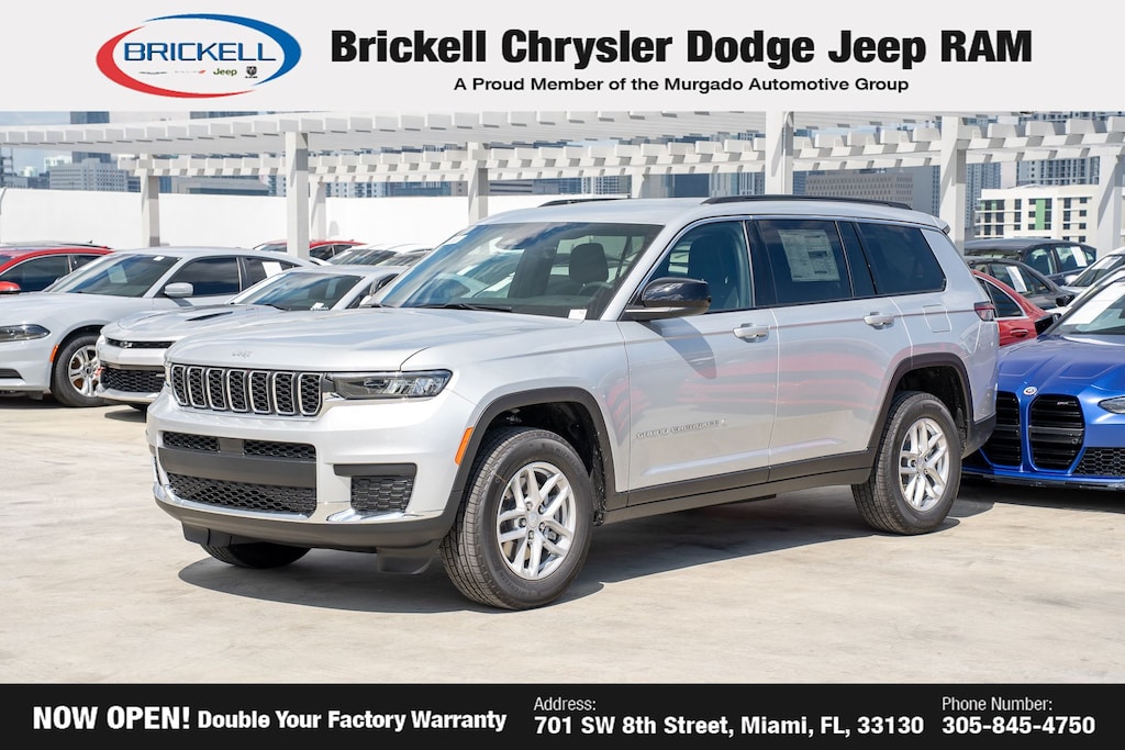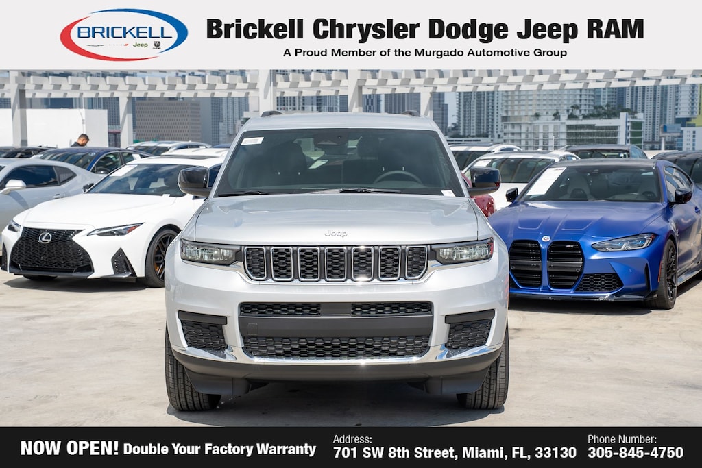 Price includes: $1000 - 2025 National Grand Cherokee Loyalty Retail Bonus Cash . Exp. 11/03/2025 $500 - 2025 National 2025 First Responder Bonus Cash. Exp. 01/05/2026 $500 - 2025 National 2025 Military Bonus Cash. Exp. 01/05/2026 Discover Your Next Vehicle at Brickell Chrysler Dodge Jeep Ram Welcome to Brickell CDJR, where we go beyond selling cars. We double the factory powertrain warranty, giving you added peace of mind. Our dealership offers one of the largest new car inventories in the region, ensuring you find the right vehicle Prices displayed do not included our Perma-plate. Our state-of-the-art service department is the largest in the country and is open seven days a week from 7 AM to 9 PM. Visit us at 701 SW 8th St, Miami, FL 33130, or call 305-777-2800 to learn more and schedule a test drive. The displayed price includes an incentive for financing with Brickell CDJR Finance Company. Outside financing and bank drafts are not accepted. All pre-owned vehicle exports are subject to an export fee. Prices apply only to customers who live, work, or worship in Broward, Miami-Dade, Palm Beach, Monroe, Collier, Hendry, Lee, Glades, Martin, St. Lucie, Okeechobee, Manatee, Hillsborough, Osceola, or Orange County. Customers outside these counties will pay an additional $ Taxes, title, registration, and dealer fees apply. Factory MSRP: $41,625 Silver Zynith 2025 Jeep Grand Cherokee L Laredo RWD 8-Speed Automatic 3.6L V6 24V VVT