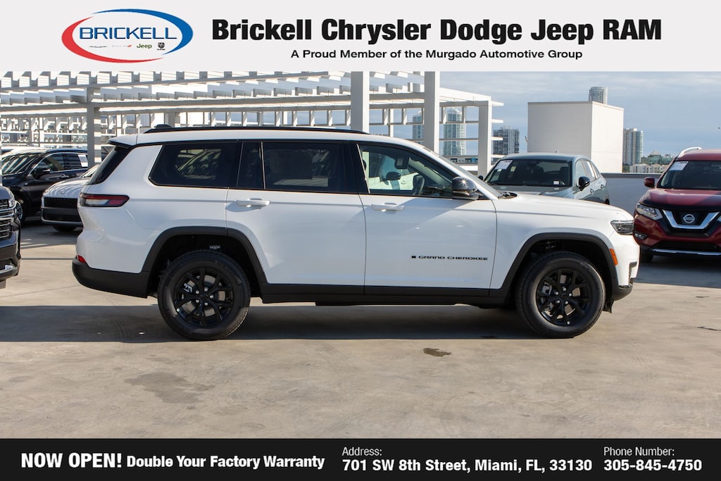 Price includes: $1000 - 2025 National Grand Cherokee Loyalty Retail Bonus Cash . Exp. 12/01/2025 $500 - 2025 National 2025 First Responder Bonus Cash. Exp. 01/05/2026 $500 - 2025 National 2025 Military Bonus Cash. Exp. 01/05/2026 $500 - 2025 South BC Retail Bonus Cash . Exp. 12/01/2025 Discover Your Next Vehicle at Brickell Chrysler Dodge Jeep Ram Welcome to Brickell CDJR, where we go beyond selling cars. We double the factory powertrain warranty, giving you added peace of mind. Our dealership offers one of the largest new car inventories in the region, ensuring you find the right vehicle Prices displayed do not included our Perma-plate. Our state-of-the-art service department is the largest in the country and is open seven days a week from 7 AM to 9 PM. Visit us at 701 SW 8th St, Miami, FL 33130, or call 305-777-2800 to learn more and schedule a test drive. The displayed price includes an incentive for financing with Brickell CDJR Finance Company. Outside financing and bank drafts are not accepted. All pre-owned vehicle exports are subject to an export fee. Prices apply only to customers who live, work, or worship in Broward, Miami-Dade, Palm Beach, Monroe, Collier, Hendry, Lee, Glades, Martin, St. Lucie, Okeechobee, Manatee, Hillsborough, Osceola, or Orange County. Customers outside these counties will pay an additional $ Taxes, title, registration, and dealer fees apply. Factory MSRP: $46,135 Bright White Clearcoat 2025 Jeep Grand Cherokee L Altitude X RWD 8-Speed Automatic 3.6L V6 24V VVT