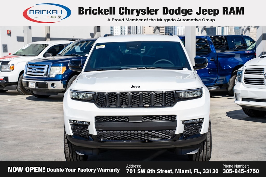Price includes: $2250 - 2025 South BC Retail Bonus Cash . Exp. 01/05/2026 $500 - 2025 National 2025 First Responder Bonus Cash. Exp. 01/05/2026 $500 - 2025 National 2025 Military Bonus Cash. Exp. 01/05/2026 Discover Your Next Vehicle at Brickell Chrysler Dodge Jeep Ram Welcome to Brickell CDJR, where we go beyond selling cars. We double the factory powertrain warranty, giving you added peace of mind. Our dealership offers one of the largest new car inventories in the region, ensuring you find the right vehicle Prices displayed do not included our Perma-plate. Our state-of-the-art service department is the largest in the country and is open seven days a week from 7 AM to 9 PM. Visit us at 701 SW 8th St, Miami, FL 33130, or call 305-777-2800 to learn more and schedule a test drive. The displayed price includes an incentive for financing with Brickell CDJR Finance Company. Outside financing and bank drafts are not accepted. All pre-owned vehicle exports are subject to an export fee. Prices apply only to customers who live, work, or worship in Broward, Miami-Dade, Palm Beach, Monroe, Collier, Hendry, Lee, Glades, Martin, St. Lucie, Okeechobee, Manatee, Hillsborough, Osceola, or Orange County. Customers outside these counties will pay an additional $ Taxes, title, registration, and dealer fees apply. Factory MSRP: $51,625 Bright White Clearcoat 2025 Jeep Grand Cherokee L Limited 4WD 8-Speed Automatic 3.6L V6 24V VVT