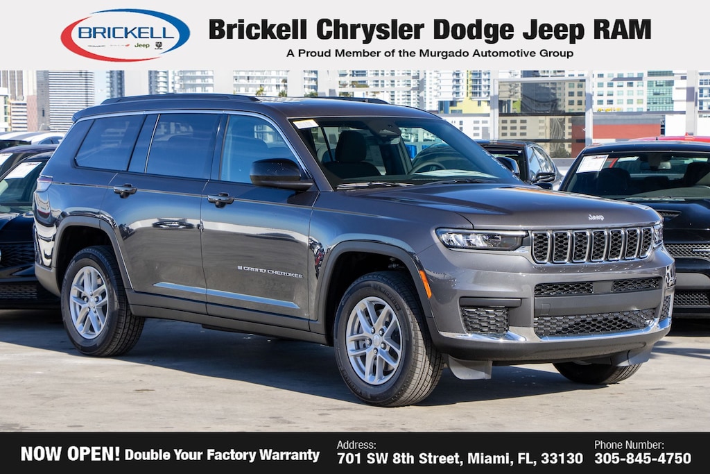Price includes: $2500 - 2025 National Retail Bonus Cash . Exp. 03/02/2026 $500 - 2025 National 2025 First Responder Bonus Cash. Exp. 01/04/2027 $500 - 2025 National 2025 Military Bonus Cash. Exp. 01/04/2027 $500 - 2025 Southeast BC Retail Bonus Cash . Exp. 03/02/2026 Discover Your Next Vehicle at Brickell Chrysler Dodge Jeep Ram Welcome to Brickell CDJR, where we go beyond selling cars. We double the factory powertrain warranty, giving you added peace of mind. Our dealership offers one of the largest new car inventories in the region, ensuring you find the right vehicle Prices displayed do not included our Perma-plate. Our state-of-the-art service department is the largest in the country and is open seven days a week from 7 AM to 9 PM. Visit us at 701 SW 8th St, Miami, FL 33130, or call 305-777-2800 to learn more and schedule a test drive. The displayed price includes an incentive for financing with Brickell CDJR Finance Company. Outside financing and bank drafts are not accepted. All pre-owned vehicle exports are subject to an export fee. Prices apply only to customers who live, work, or worship in Broward, Miami-Dade, Palm Beach, Monroe, Collier, Hendry, Lee, Glades, Martin, St. Lucie, Okeechobee, Manatee, Hillsborough, Osceola, or Orange County. Customers outside these counties will pay an additional $ Taxes, title, registration, and dealer fees apply. Factory MSRP: $44,125 Baltic Gray Metallic Clearcoat 2025 Jeep Grand Cherokee L Laredo 4WD 8-Speed Automatic 3.6L V6 24V VVT