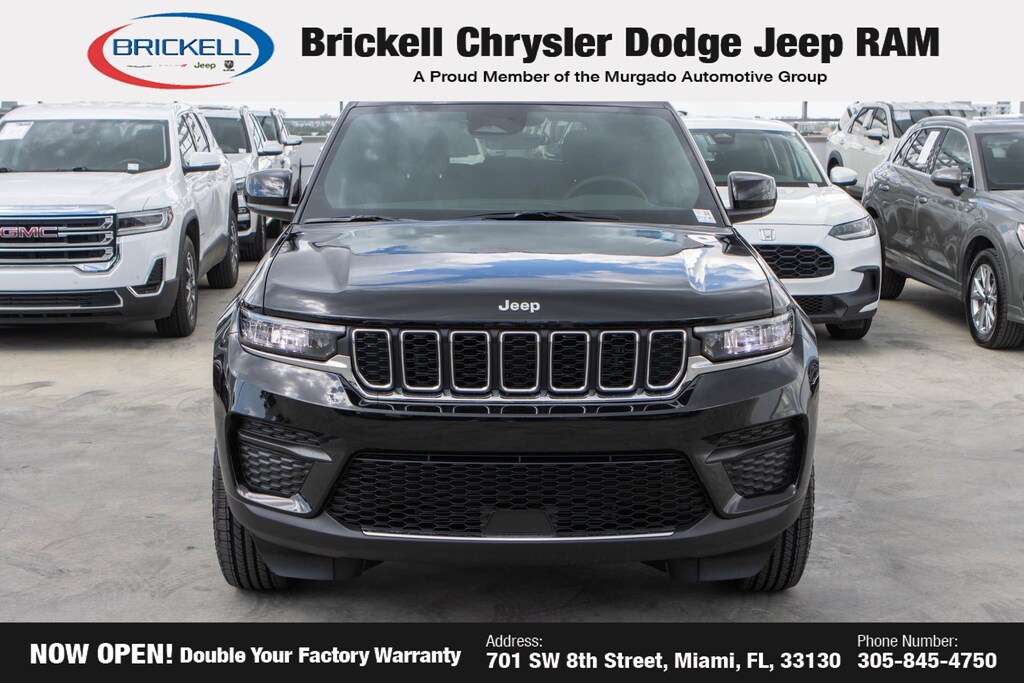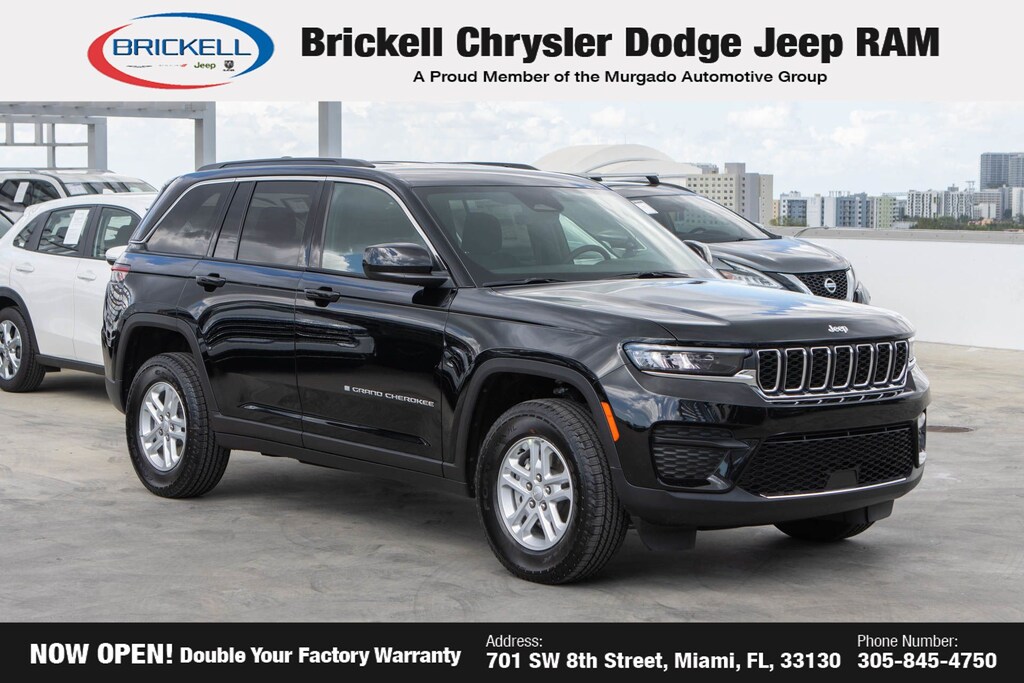 Price includes: $1000 - 2025 National Grand Cherokee Loyalty Retail Bonus Cash . Exp. 11/03/2025 $500 - 2025 National 2025 First Responder Bonus Cash. Exp. 01/05/2026 $500 - 2025 National 2025 Military Bonus Cash. Exp. 01/05/2026 Discover Your Next Vehicle at Brickell Chrysler Dodge Jeep Ram Welcome to Brickell CDJR, where we go beyond selling cars. We double the factory powertrain warranty, giving you added peace of mind. Our dealership offers one of the largest new car inventories in the region, ensuring you find the right vehicle Prices displayed do not included our Perma-plate. Our state-of-the-art service department is the largest in the country and is open seven days a week from 7 AM to 9 PM. Visit us at 701 SW 8th St, Miami, FL 33130, or call 305-777-2800 to learn more and schedule a test drive. The displayed price includes an incentive for financing with Brickell CDJR Finance Company. Outside financing and bank drafts are not accepted. All pre-owned vehicle exports are subject to an export fee. Prices apply only to customers who live, work, or worship in Broward, Miami-Dade, Palm Beach, Monroe, Collier, Hendry, Lee, Glades, Martin, St. Lucie, Okeechobee, Manatee, Hillsborough, Osceola, or Orange County. Customers outside these counties will pay an additional $ Taxes, title, registration, and dealer fees apply. Factory MSRP: $41,625 Diamond Black Crystal Pearlcoat 2025 Jeep Grand Cherokee Laredo 4WD 8-Speed Automatic 3.6L V6 24V VVT 4WD.