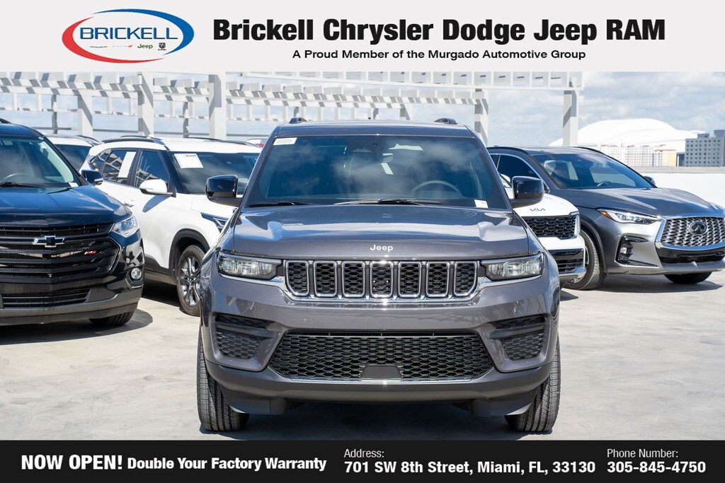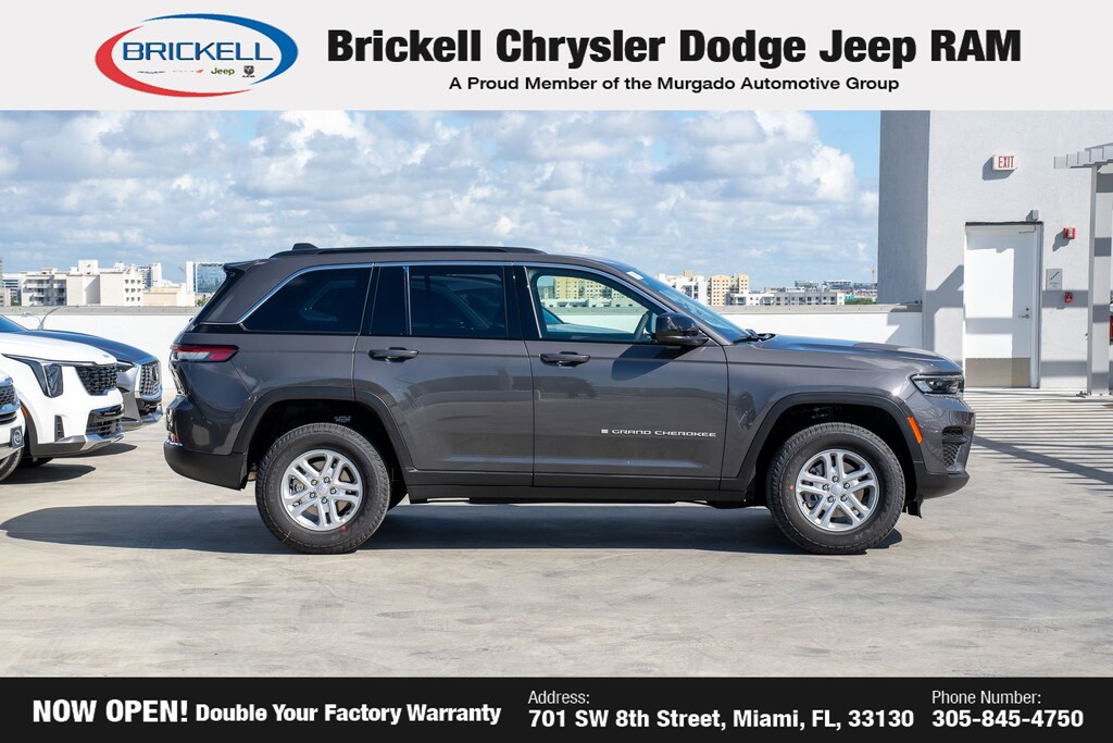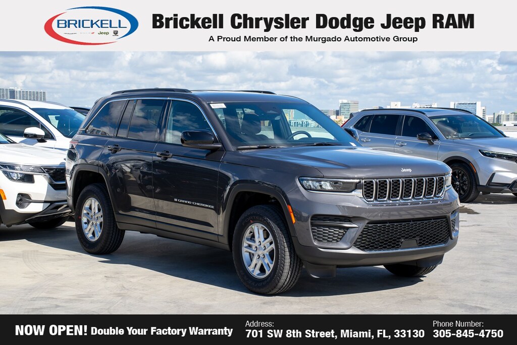 Price includes: $1000 - 2025 National Grand Cherokee Loyalty Retail Bonus Cash . Exp. 11/03/2025 $500 - 2025 National 2025 First Responder Bonus Cash. Exp. 01/05/2026 $500 - 2025 National 2025 Military Bonus Cash. Exp. 01/05/2026 Discover Your Next Vehicle at Brickell Chrysler Dodge Jeep Ram Welcome to Brickell CDJR, where we go beyond selling cars. We double the factory powertrain warranty, giving you added peace of mind. Our dealership offers one of the largest new car inventories in the region, ensuring you find the right vehicle Prices displayed do not included our Perma-plate. Our state-of-the-art service department is the largest in the country and is open seven days a week from 7 AM to 9 PM. Visit us at 701 SW 8th St, Miami, FL 33130, or call 305-777-2800 to learn more and schedule a test drive. The displayed price includes an incentive for financing with Brickell CDJR Finance Company. Outside financing and bank drafts are not accepted. All pre-owned vehicle exports are subject to an export fee. Prices apply only to customers who live, work, or worship in Broward, Miami-Dade, Palm Beach, Monroe, Collier, Hendry, Lee, Glades, Martin, St. Lucie, Okeechobee, Manatee, Hillsborough, Osceola, or Orange County. Customers outside these counties will pay an additional $ Taxes, title, registration, and dealer fees apply. New Price! Factory MSRP: $41,420 Baltic Gray Metallic Clearcoat 2025 Jeep Grand Cherokee Laredo RWD 8-Speed Automatic 3.6L V6 24V VVT