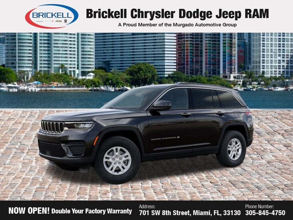 Discover Your Next Vehicle at Brickell Chrysler Dodge Jeep Ram Welcome to Brickell CDJR, where we go beyond selling cars. We double the factory powertrain warranty, giving you added peace of mind. Our dealership offers one of the largest new car inventories in the region, ensuring you find the right vehicle Prices displayed do not included our Perma-plate. Our state-of-the-art service department is the largest in the country and is open seven days a week from 7 AM to 9 PM. Visit us at 701 SW 8th St, Miami, FL 33130, or call 305-777-2800 to learn more and schedule a test drive. The displayed price includes an incentive for financing with Brickell CDJR Finance Company. Outside financing and bank drafts are not accepted. All pre-owned vehicle exports are subject to an export fee. Prices apply only to customers who live, work, or worship in Broward, Miami-Dade, Palm Beach, Monroe, Collier, Hendry, Lee, Glades, Martin, St. Lucie, Okeechobee, Manatee, Hillsborough, Osceola, or Orange County. Customers outside these counties will pay an additional $ Taxes, title, registration, and dealer fees apply. Factory MSRP: $41,420 Diamond Black Crystal Pearlcoat 2025 Jeep Grand Cherokee Laredo RWD 8-Speed Automatic 3.6L V6 24V VVT
