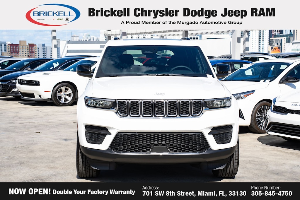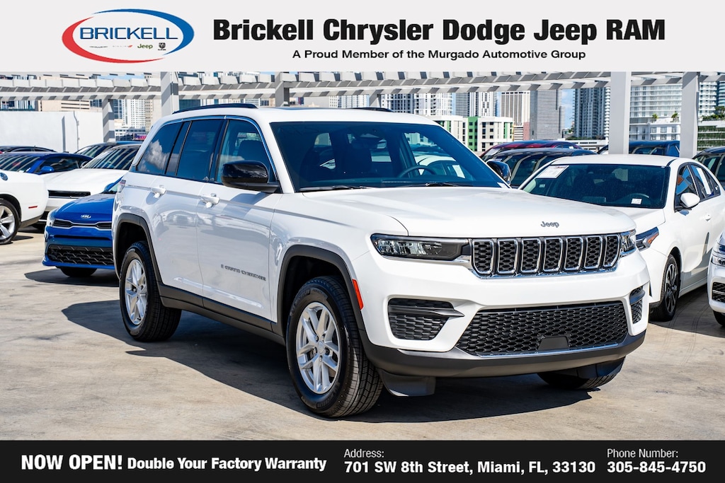 Price includes: $1500 - 2025 National Stellantis Loyalty Retail Bonus Cash . Exp. 01/05/2026 $2000 - 2025 National Holiday Select Inventory Bonus Cash. Exp. 01/05/2026 $2250 - 2025 National Retail Bonus Cash . Exp. 01/05/2026 $500 - 2025 National 2025 First Responder Bonus Cash. Exp. 01/05/2026 $500 - 2025 National 2025 Military Bonus Cash. Exp. 01/05/2026 $500 - 2025 South BC Retail Bonus Cash . Exp. 01/05/2026 $1,500 - Exp. 12/30/2025 Discover Your Next Vehicle at Brickell Chrysler Dodge Jeep Ram Welcome to Brickell CDJR, where we go beyond selling cars. We double the factory powertrain warranty, giving you added peace of mind. Our dealership offers one of the largest new car inventories in the region, ensuring you find the right vehicle Prices displayed do not included our Perma-plate. Our state-of-the-art service department is the largest in the country and is open seven days a week from 7 AM to 9 PM. Visit us at 701 SW 8th St, Miami, FL 33130, or call 305-777-2800 to learn more and schedule a test drive. The displayed price includes an incentive for financing with Brickell CDJR Finance Company. Outside financing and bank drafts are not accepted. All pre-owned vehicle exports are subject to an export fee. Prices apply only to customers who live, work, or worship in Broward, Miami-Dade, Palm Beach, Monroe, Collier, Hendry, Lee, Glades, Martin, St. Lucie, Okeechobee, Manatee, Hillsborough, Osceola, or Orange County. Customers outside these counties will pay an additional $ Taxes, title, registration, and dealer fees apply. Factory MSRP: $43,575 Bright White Clearcoat 2025 Jeep Grand Cherokee Laredo X 4WD 8-Speed Automatic 3.6L V6 24V VVT 4WD.