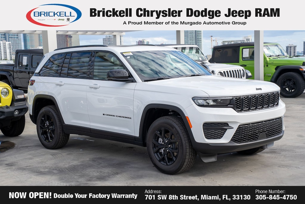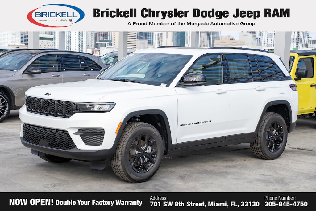 Price includes: $1500 - 2025 Southeast BC Retail Bonus Cash . Exp. 03/31/2026 $2000 - 2025 National Bonus Cash . Exp. 03/31/2026 $2250 - 2025 National Retail Bonus Cash . Exp. 03/31/2026 $500 - 2025 National 2025 First Responder Bonus Cash. Exp. 01/04/2027 $500 - 2025 National 2025 Military Bonus Cash. Exp. 01/04/2027 Discover Your Next Vehicle at Brickell Chrysler Dodge Jeep Ram Welcome to Brickell CDJR, where we go beyond selling cars. We double the factory powertrain warranty, giving you added peace of mind. Our dealership offers one of the largest new car inventories in the region, ensuring you find the right vehicle Prices displayed do not included our Perma-plate. Our state-of-the-art service department is the largest in the country and is open seven days a week from 7 AM to 9 PM. Visit us at 701 SW 8th St, Miami, FL 33130, or call 305-777-2800 to learn more and schedule a test drive. The displayed price includes an incentive for financing with Brickell CDJR Finance Company. Outside financing and bank drafts are not accepted. All pre-owned vehicle exports are subject to an export fee. Prices apply only to customers who live, work, or worship in Broward, Miami-Dade, Palm Beach, Monroe, Collier, Hendry, Lee, Glades, Martin, St. Lucie, Okeechobee, Manatee, Hillsborough, Osceola, or Orange County. Customers outside these counties will pay an additional $ Taxes, title, registration, and dealer fees apply. Factory MSRP: $44,135 Bright White Clearcoat 2025 Jeep Grand Cherokee Altitude X RWD 8-Speed Automatic 3.6L V6 24V VVT