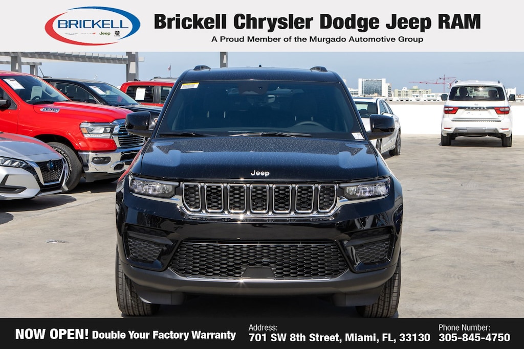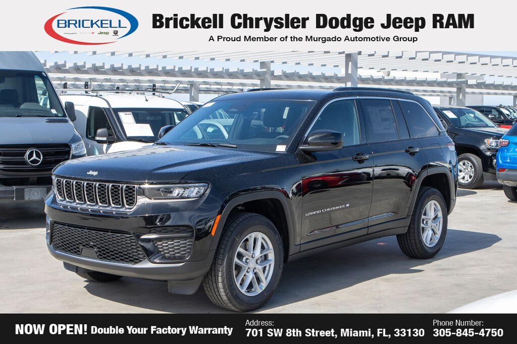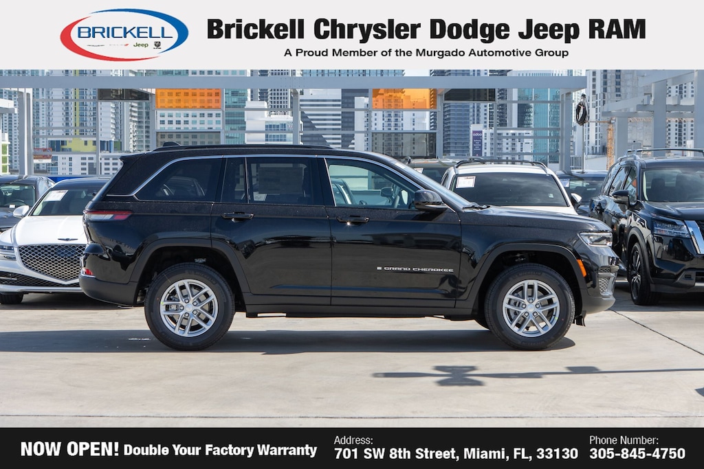 Price includes: $500 - 2025 National 2025 First Responder Bonus Cash. Exp. 01/05/2026 $500 - 2025 National 2025 Military Bonus Cash. Exp. 01/05/2026 $500 - 2025 South BC Retail Bonus Cash . Exp. 01/05/2026 Discover Your Next Vehicle at Brickell Chrysler Dodge Jeep Ram Welcome to Brickell CDJR, where we go beyond selling cars. We double the factory powertrain warranty, giving you added peace of mind. Our dealership offers one of the largest new car inventories in the region, ensuring you find the right vehicle Prices displayed do not included our Perma-plate. Our state-of-the-art service department is the largest in the country and is open seven days a week from 7 AM to 9 PM. Visit us at 701 SW 8th St, Miami, FL 33130, or call 305-777-2800 to learn more and schedule a test drive. The displayed price includes an incentive for financing with Brickell CDJR Finance Company. Outside financing and bank drafts are not accepted. All pre-owned vehicle exports are subject to an export fee. Prices apply only to customers who live, work, or worship in Broward, Miami-Dade, Palm Beach, Monroe, Collier, Hendry, Lee, Glades, Martin, St. Lucie, Okeechobee, Manatee, Hillsborough, Osceola, or Orange County. Customers outside these counties will pay an additional $ Taxes, title, registration, and dealer fees apply. Factory MSRP: $40,375 Diamond Black Crystal Pearlcoat 2025 Jeep Grand Cherokee Laredo X RWD 8-Speed Automatic 3.6L V6 24V VVT