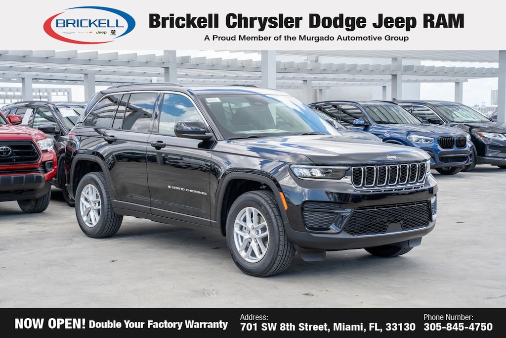 Price includes: $1000 - 2025 National Grand Cherokee Loyalty Retail Bonus Cash . Exp. 11/03/2025 $500 - 2025 National 2025 First Responder Bonus Cash. Exp. 01/05/2026 $500 - 2025 National 2025 Military Bonus Cash. Exp. 01/05/2026 Discover Your Next Vehicle at Brickell Chrysler Dodge Jeep Ram Welcome to Brickell CDJR, where we go beyond selling cars. We double the factory powertrain warranty, giving you added peace of mind. Our dealership offers one of the largest new car inventories in the region, ensuring you find the right vehicle Prices displayed do not included our Perma-plate. Our state-of-the-art service department is the largest in the country and is open seven days a week from 7 AM to 9 PM. Visit us at 701 SW 8th St, Miami, FL 33130, or call 305-777-2800 to learn more and schedule a test drive. The displayed price includes an incentive for financing with Brickell CDJR Finance Company. Outside financing and bank drafts are not accepted. All pre-owned vehicle exports are subject to an export fee. Prices apply only to customers who live, work, or worship in Broward, Miami-Dade, Palm Beach, Monroe, Collier, Hendry, Lee, Glades, Martin, St. Lucie, Okeechobee, Manatee, Hillsborough, Osceola, or Orange County. Customers outside these counties will pay an additional $ Taxes, title, registration, and dealer fees apply. Factory MSRP: $40,375 Diamond Black Crystal Pearlcoat 2025 Jeep Grand Cherokee Laredo X RWD 8-Speed Automatic 3.6L V6 24V VVT