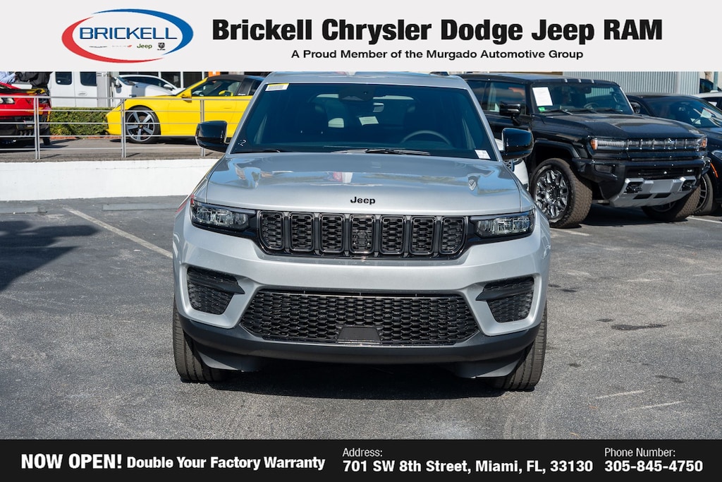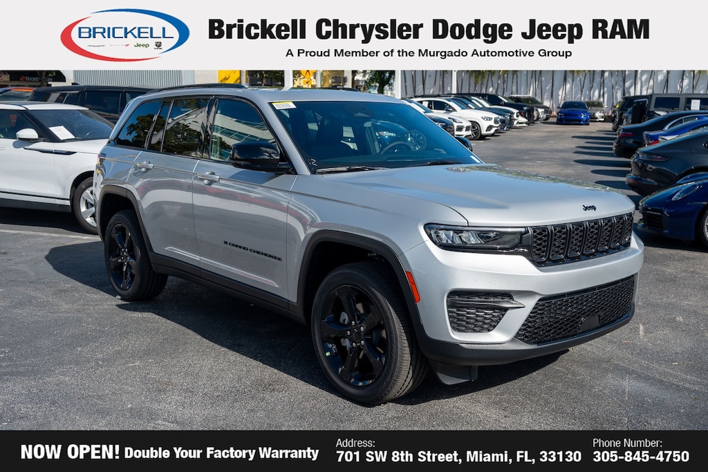 Price includes: $1500 - 2025 National Stellantis Loyalty Retail Bonus Cash . Exp. 02/02/2026 $2250 - 2025 National Retail Bonus Cash . Exp. 02/02/2026 $500 - 2025 National 2025 First Responder Bonus Cash. Exp. 01/04/2027 $500 - 2025 National 2025 Military Bonus Cash. Exp. 01/04/2027 $500 - 2025 South BC Retail Bonus Cash . Exp. 01/20/2026 Discover Your Next Vehicle at Brickell Chrysler Dodge Jeep Ram Welcome to Brickell CDJR, where we go beyond selling cars. We double the factory powertrain warranty, giving you added peace of mind. Our dealership offers one of the largest new car inventories in the region, ensuring you find the right vehicle Prices displayed do not included our Perma-plate. Our state-of-the-art service department is the largest in the country and is open seven days a week from 7 AM to 9 PM. Visit us at 701 SW 8th St, Miami, FL 33130, or call 305-777-2800 to learn more and schedule a test drive. The displayed price includes an incentive for financing with Brickell CDJR Finance Company. Outside financing and bank drafts are not accepted. All pre-owned vehicle exports are subject to an export fee. Prices apply only to customers who live, work, or worship in Broward, Miami-Dade, Palm Beach, Monroe, Collier, Hendry, Lee, Glades, Martin, St. Lucie, Okeechobee, Manatee, Hillsborough, Osceola, or Orange County. Customers outside these counties will pay an additional $ Taxes, title, registration, and dealer fees apply. Factory MSRP: $46,375 Silver Zynith 2025 Jeep Grand Cherokee Laredo RWD 8-Speed Automatic 3.6L V6 24V VVT