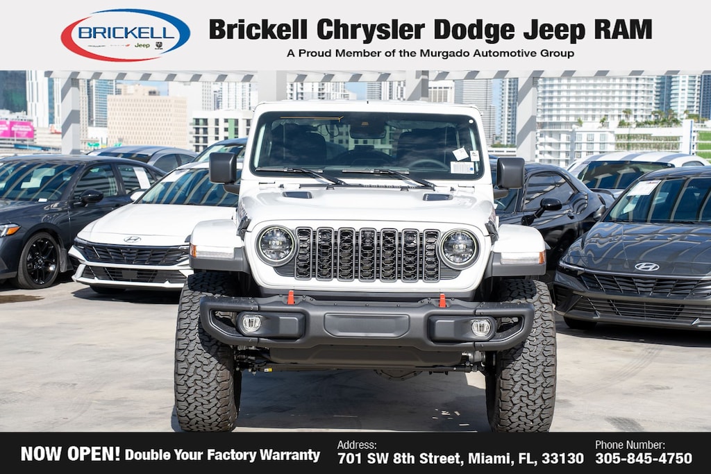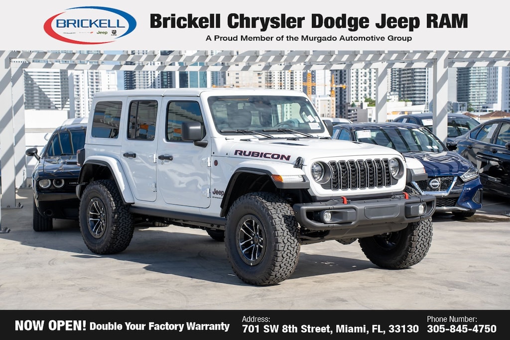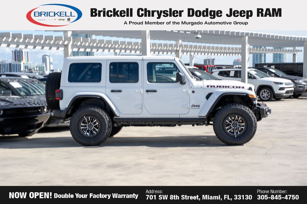 Price includes: $2500 - 2025 National Retail Bonus Cash . Exp. 11/03/2025 $500 - 2025 National 2025 First Responder Bonus Cash. Exp. 01/05/2026 Discover Your Next Vehicle at Brickell Chrysler Dodge Jeep Ram Welcome to Brickell CDJR, where we go beyond selling cars. We double the factory powertrain warranty, giving you added peace of mind. Our dealership offers one of the largest new car inventories in the region, ensuring you find the right vehicle Prices displayed do not included our Perma-plate. Our state-of-the-art service department is the largest in the country and is open seven days a week from 7 AM to 9 PM. Visit us at 701 SW 8th St, Miami, FL 33130, or call 305-777-2800 to learn more and schedule a test drive. The displayed price includes an incentive for financing with Brickell CDJR Finance Company. Outside financing and bank drafts are not accepted. All pre-owned vehicle exports are subject to an export fee. Prices apply only to customers who live, work, or worship in Broward, Miami-Dade, Palm Beach, Monroe, Collier, Hendry, Lee, Glades, Martin, St. Lucie, Okeechobee, Manatee, Hillsborough, Osceola, or Orange County. Customers outside these counties will pay an additional $ Taxes, title, registration, and dealer fees apply. Factory MSRP: $71,165 Bright White Clearcoat 2025 Jeep Wrangler Rubicon X 4WD 8-Speed Automatic 3.6L V6 24V VVT