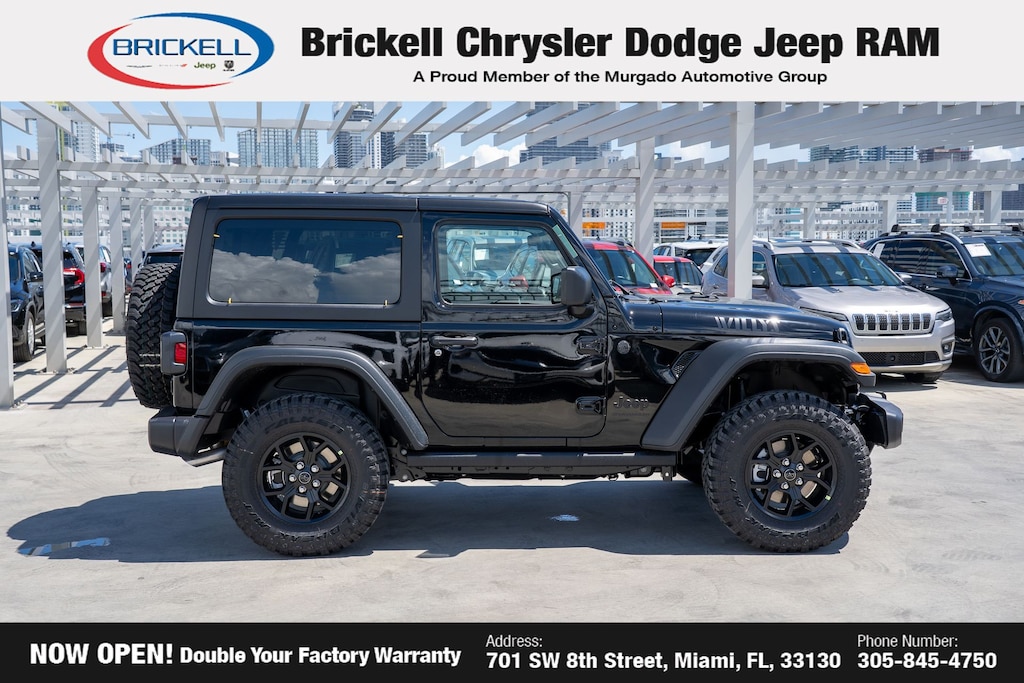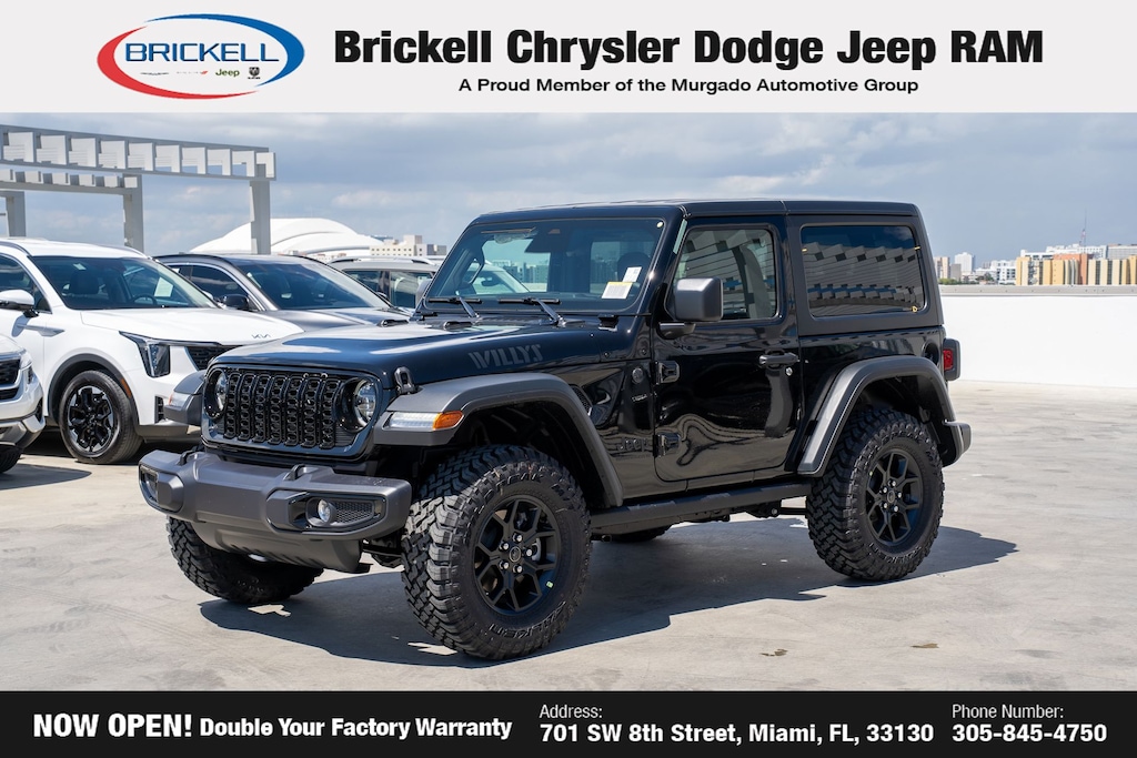 Price includes: $500 - 2025 National 2025 First Responder Bonus Cash. Exp. 01/05/2026 $500 - 2025 National 2025 Military Bonus Cash. Exp. 01/05/2026 Discover Your Next Vehicle at Brickell Chrysler Dodge Jeep Ram Welcome to Brickell CDJR, where we go beyond selling cars. We double the factory powertrain warranty, giving you added peace of mind. Our dealership offers one of the largest new car inventories in the region, ensuring you find the right vehicle Prices displayed do not included our Perma-plate. Our state-of-the-art service department is the largest in the country and is open seven days a week from 7 AM to 9 PM. Visit us at 701 SW 8th St, Miami, FL 33130, or call 305-777-2800 to learn more and schedule a test drive. The displayed price includes an incentive for financing with Brickell CDJR Finance Company. Outside financing and bank drafts are not accepted. All pre-owned vehicle exports are subject to an export fee. Prices apply only to customers who live, work, or worship in Broward, Miami-Dade, Palm Beach, Monroe, Collier, Hendry, Lee, Glades, Martin, St. Lucie, Okeechobee, Manatee, Hillsborough, Osceola, or Orange County. Customers outside these counties will pay an additional $ Taxes, title, registration, and dealer fees apply. Factory MSRP: $46,480 Black Clearcoat 2025 Jeep Wrangler Willys 4WD 8-Speed Automatic 2.0L I4 DOHC