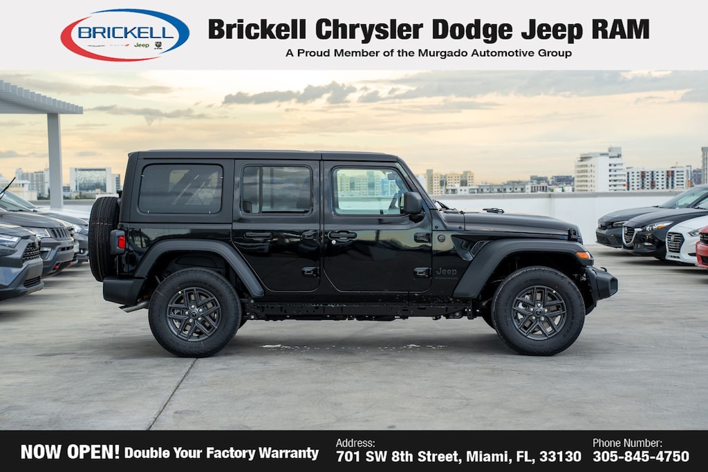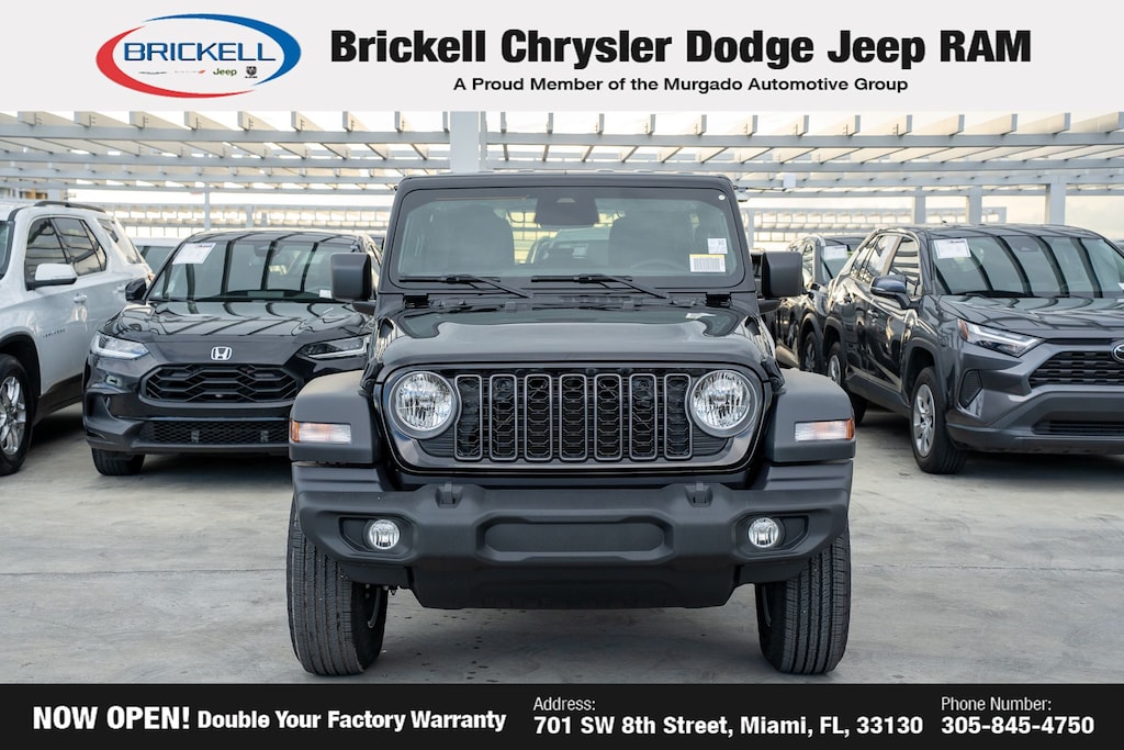 Price includes: $500 - 2025 National 2025 First Responder Bonus Cash. Exp. 01/05/2026 $500 - 2025 National 2025 Military Bonus Cash. Exp. 01/05/2026 Discover Your Next Vehicle at Brickell Chrysler Dodge Jeep Ram Welcome to Brickell CDJR, where we go beyond selling cars. We double the factory powertrain warranty, giving you added peace of mind. Our dealership offers one of the largest new car inventories in the region, ensuring you find the right vehicle Prices displayed do not included our Perma-plate. Our state-of-the-art service department is the largest in the country and is open seven days a week from 7 AM to 9 PM. Visit us at 701 SW 8th St, Miami, FL 33130, or call 305-777-2800 to learn more and schedule a test drive. The displayed price includes an incentive for financing with Brickell CDJR Finance Company. Outside financing and bank drafts are not accepted. All pre-owned vehicle exports are subject to an export fee. Prices apply only to customers who live, work, or worship in Broward, Miami-Dade, Palm Beach, Monroe, Collier, Hendry, Lee, Glades, Martin, St. Lucie, Okeechobee, Manatee, Hillsborough, Osceola, or Orange County. Customers outside these counties will pay an additional $ Taxes, title, registration, and dealer fees apply. Factory MSRP: $47,180 Black Clearcoat 2025 Jeep Wrangler Sport S 4WD 8-Speed Automatic 2.0L I4 DOHC