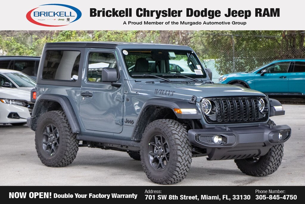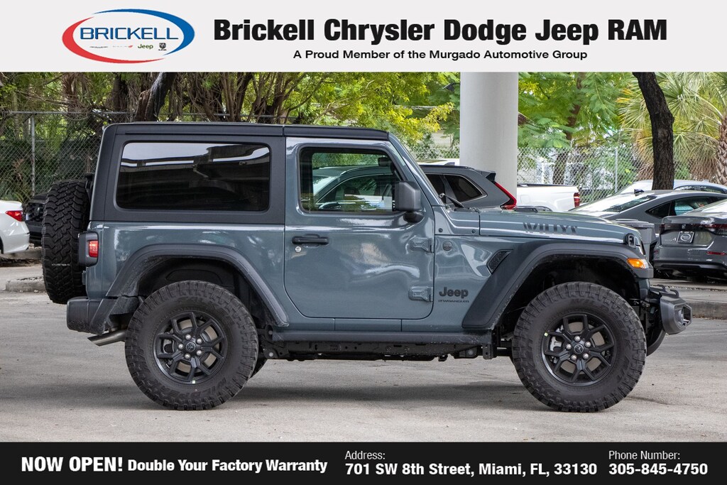 Price includes: $1500 - 2025 National Stellantis Loyalty Retail Bonus Cash . Exp. 02/02/2026 $2000 - 2025 National Retail Bonus Cash . Exp. 02/02/2026 $500 - 2025 National 2025 First Responder Bonus Cash. Exp. 01/04/2027 $500 - 2025 National 2025 Military Bonus Cash. Exp. 01/04/2027 Discover Your Next Vehicle at Brickell Chrysler Dodge Jeep Ram Welcome to Brickell CDJR, where we go beyond selling cars. We double the factory powertrain warranty, giving you added peace of mind. Our dealership offers one of the largest new car inventories in the region, ensuring you find the right vehicle Prices displayed do not included our Perma-plate. Our state-of-the-art service department is the largest in the country and is open seven days a week from 7 AM to 9 PM. Visit us at 701 SW 8th St, Miami, FL 33130, or call 305-777-2800 to learn more and schedule a test drive. The displayed price includes an incentive for financing with Brickell CDJR Finance Company. Outside financing and bank drafts are not accepted. All pre-owned vehicle exports are subject to an export fee. Prices apply only to customers who live, work, or worship in Broward, Miami-Dade, Palm Beach, Monroe, Collier, Hendry, Lee, Glades, Martin, St. Lucie, Okeechobee, Manatee, Hillsborough, Osceola, or Orange County. Customers outside these counties will pay an additional $ Taxes, title, registration, and dealer fees apply. Factory MSRP: $46,480 Anvil Clear Coat 2025 Jeep Wrangler Willys 4WD 8-Speed Automatic 2.0L I4 DOHC