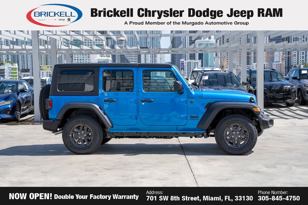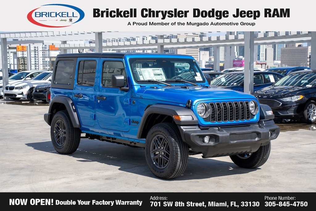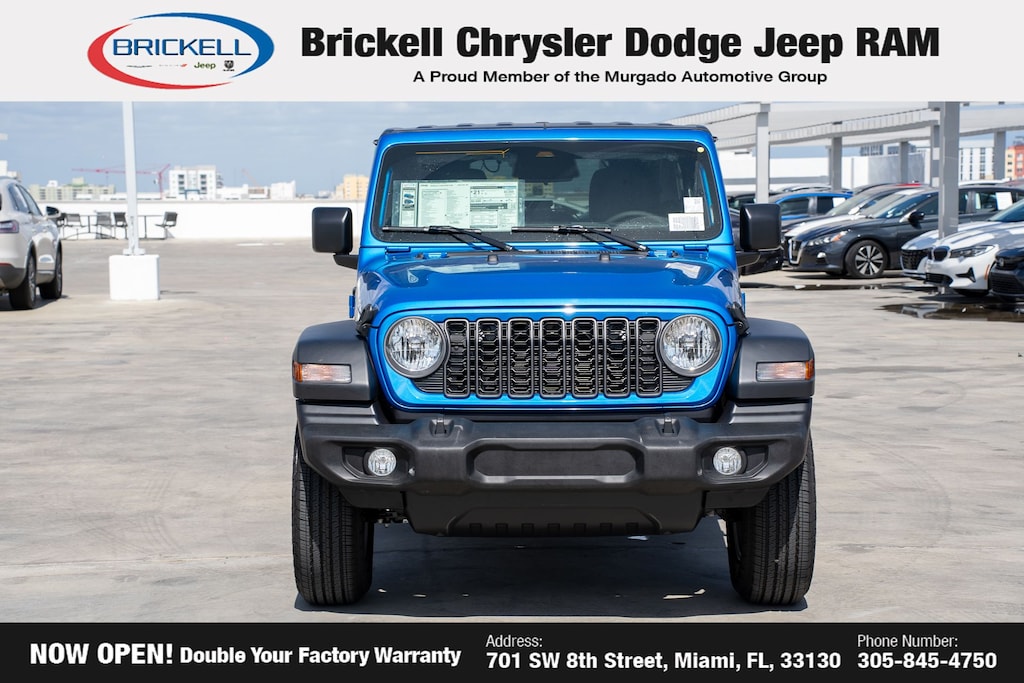 Price includes: $500 - 2025 National 2025 First Responder Bonus Cash. Exp. 01/05/2026 $500 - 2025 National 2025 Military Bonus Cash. Exp. 01/05/2026 Discover Your Next Vehicle at Brickell Chrysler Dodge Jeep Ram Welcome to Brickell CDJR, where we go beyond selling cars. We double the factory powertrain warranty, giving you added peace of mind. Our dealership offers one of the largest new car inventories in the region, ensuring you find the right vehicle Prices displayed do not included our Perma-plate. Our state-of-the-art service department is the largest in the country and is open seven days a week from 7 AM to 9 PM. Visit us at 701 SW 8th St, Miami, FL 33130, or call 305-777-2800 to learn more and schedule a test drive. The displayed price includes an incentive for financing with Brickell CDJR Finance Company. Outside financing and bank drafts are not accepted. All pre-owned vehicle exports are subject to an export fee. Prices apply only to customers who live, work, or worship in Broward, Miami-Dade, Palm Beach, Monroe, Collier, Hendry, Lee, Glades, Martin, St. Lucie, Okeechobee, Manatee, Hillsborough, Osceola, or Orange County. Customers outside these counties will pay an additional $ Taxes, title, registration, and dealer fees apply. Factory MSRP: $47,180 Hydro Blue Pearl Coat 2025 Jeep Wrangler Sport S 4WD 8-Speed Automatic 2.0L I4 DOHC