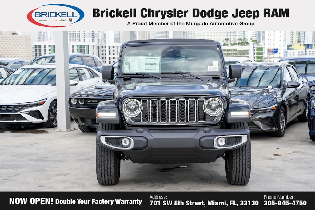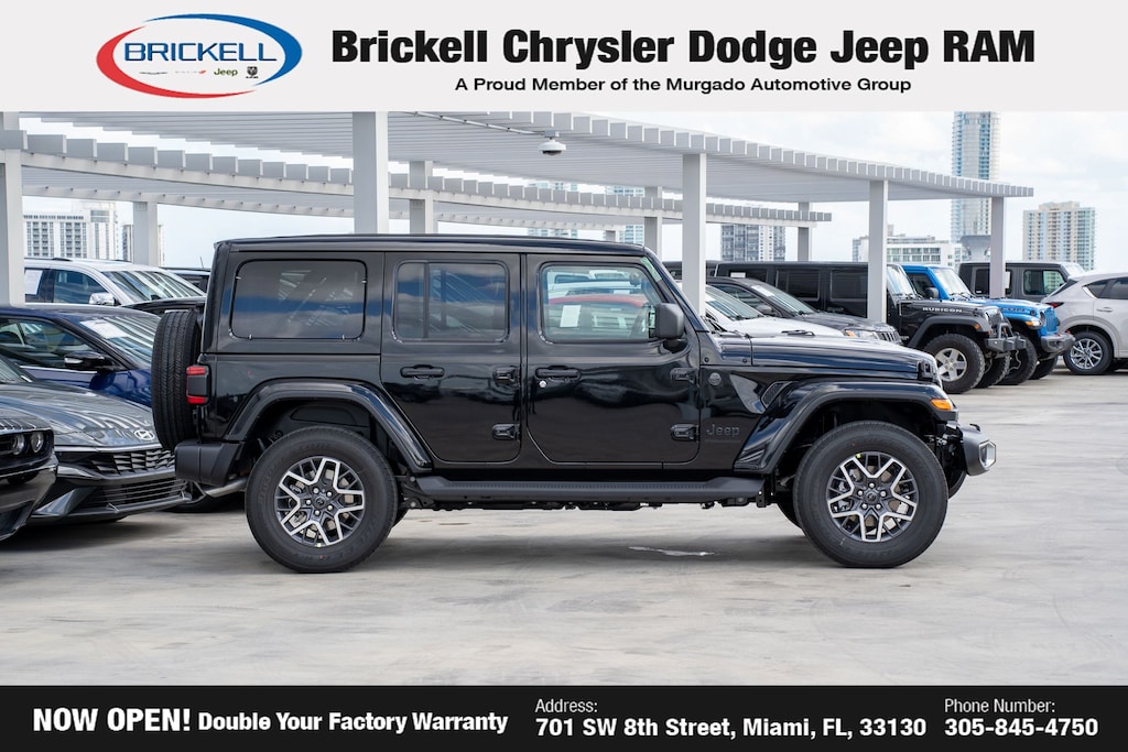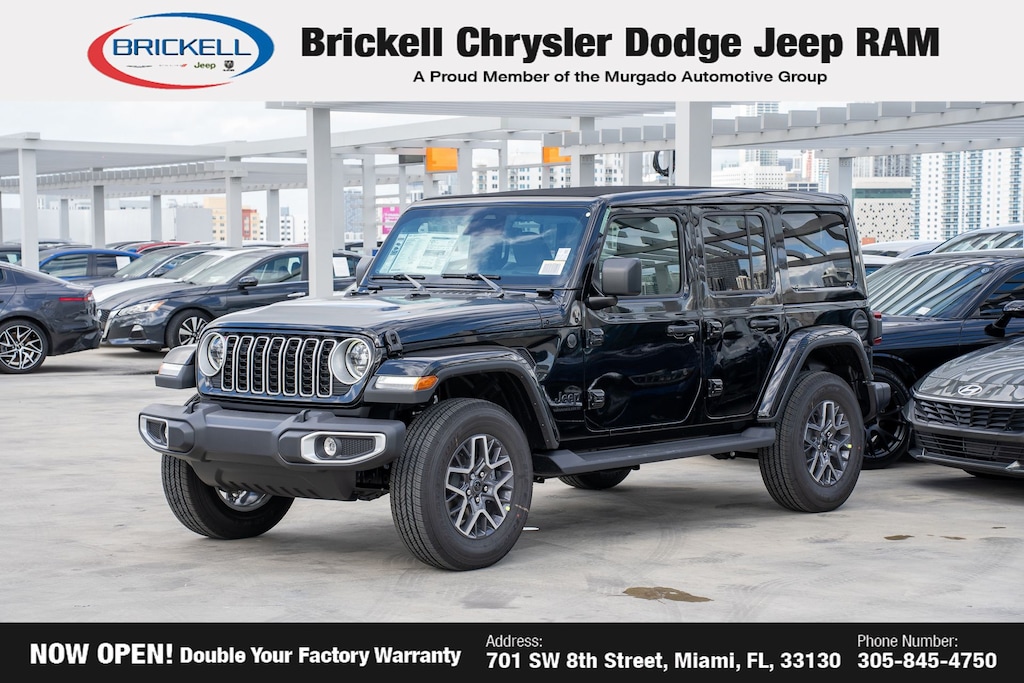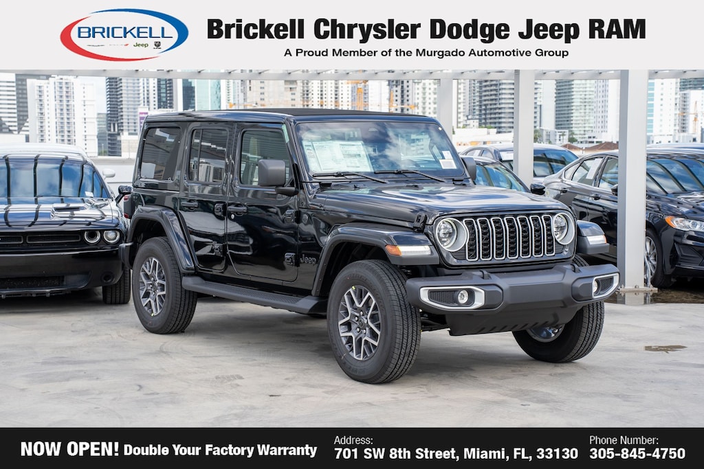 Price includes: $500 - 2025 National 2025 First Responder Bonus Cash. Exp. 01/05/2026 $500 - 2025 National 2025 Military Bonus Cash. Exp. 01/05/2026 Discover Your Next Vehicle at Brickell Chrysler Dodge Jeep Ram Welcome to Brickell CDJR, where we go beyond selling cars. We double the factory powertrain warranty, giving you added peace of mind. Our dealership offers one of the largest new car inventories in the region, ensuring you find the right vehicle Prices displayed do not included our Perma-plate. Our state-of-the-art service department is the largest in the country and is open seven days a week from 7 AM to 9 PM. Visit us at 701 SW 8th St, Miami, FL 33130, or call 305-777-2800 to learn more and schedule a test drive. The displayed price includes an incentive for financing with Brickell CDJR Finance Company. Outside financing and bank drafts are not accepted. All pre-owned vehicle exports are subject to an export fee. Prices apply only to customers who live, work, or worship in Broward, Miami-Dade, Palm Beach, Monroe, Collier, Hendry, Lee, Glades, Martin, St. Lucie, Okeechobee, Manatee, Hillsborough, Osceola, or Orange County. Customers outside these counties will pay an additional $ Taxes, title, registration, and dealer fees apply. Factory MSRP: $56,220 Black Clearcoat 2025 Jeep Wrangler Sahara 4WD 8-Speed Automatic 2.0L I4 DOHC