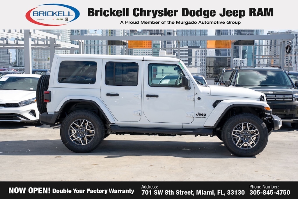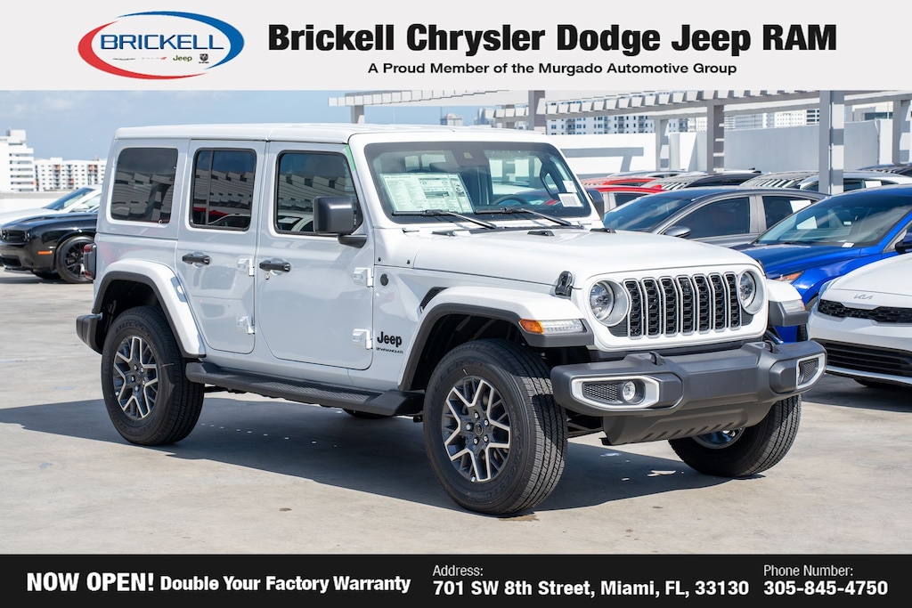 Price includes: $1500 - 2025 National Bonus Cash . Exp. 12/01/2025 $2500 - 2025 National Retail Bonus Cash . Exp. 12/01/2025 $500 - 2025 National 2025 First Responder Bonus Cash. Exp. 01/05/2026 Discover Your Next Vehicle at Brickell Chrysler Dodge Jeep Ram Welcome to Brickell CDJR, where we go beyond selling cars. We double the factory powertrain warranty, giving you added peace of mind. Our dealership offers one of the largest new car inventories in the region, ensuring you find the right vehicle Prices displayed do not included our Perma-plate. Our state-of-the-art service department is the largest in the country and is open seven days a week from 7 AM to 9 PM. Visit us at 701 SW 8th St, Miami, FL 33130, or call 305-777-2800 to learn more and schedule a test drive. The displayed price includes an incentive for financing with Brickell CDJR Finance Company. Outside financing and bank drafts are not accepted. All pre-owned vehicle exports are subject to an export fee. Prices apply only to customers who live, work, or worship in Broward, Miami-Dade, Palm Beach, Monroe, Collier, Hendry, Lee, Glades, Martin, St. Lucie, Okeechobee, Manatee, Hillsborough, Osceola, or Orange County. Customers outside these counties will pay an additional $ Taxes, title, registration, and dealer fees apply. Factory MSRP: $58,720 Bright White Clearcoat 2025 Jeep Wrangler Sahara 4WD 8-Speed Automatic 3.6L V6 24V VVT
