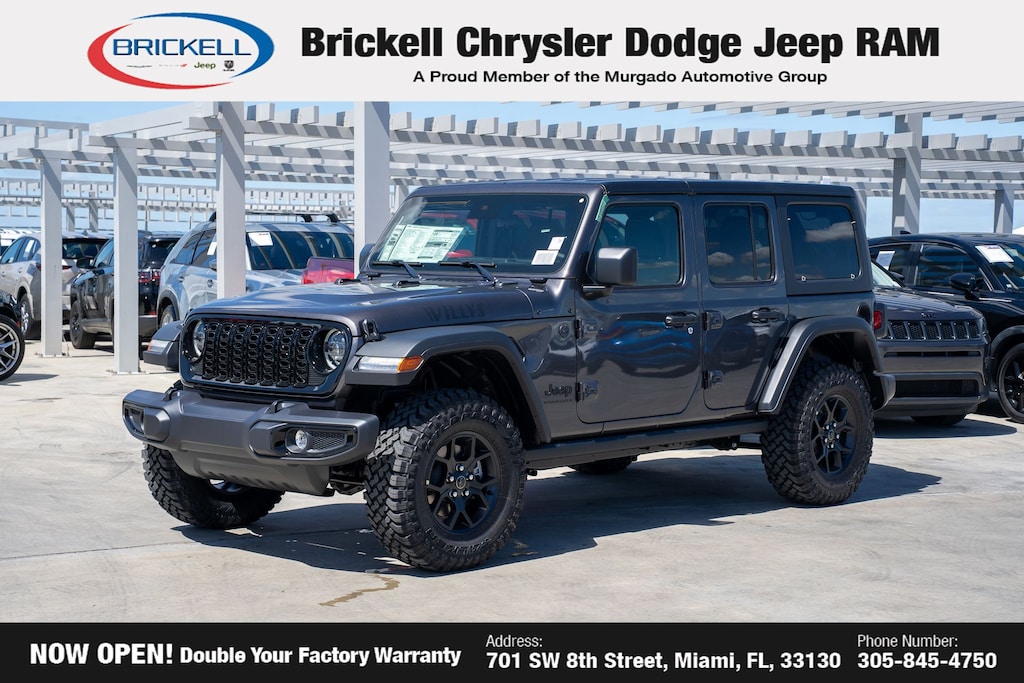 Price includes: $2500 - 2025 National Retail Bonus Cash . Exp. 11/03/2025 $500 - 2025 National 2025 First Responder Bonus Cash. Exp. 01/05/2026 Discover Your Next Vehicle at Brickell Chrysler Dodge Jeep Ram Welcome to Brickell CDJR, where we go beyond selling cars. We double the factory powertrain warranty, giving you added peace of mind. Our dealership offers one of the largest new car inventories in the region, ensuring you find the right vehicle Prices displayed do not included our Perma-plate. Our state-of-the-art service department is the largest in the country and is open seven days a week from 7 AM to 9 PM. Visit us at 701 SW 8th St, Miami, FL 33130, or call 305-777-2800 to learn more and schedule a test drive. The displayed price includes an incentive for financing with Brickell CDJR Finance Company. Outside financing and bank drafts are not accepted. All pre-owned vehicle exports are subject to an export fee. Prices apply only to customers who live, work, or worship in Broward, Miami-Dade, Palm Beach, Monroe, Collier, Hendry, Lee, Glades, Martin, St. Lucie, Okeechobee, Manatee, Hillsborough, Osceola, or Orange County. Customers outside these counties will pay an additional $ Taxes, title, registration, and dealer fees apply. Factory MSRP: $55,270 Granite Crystal Metallic Clearcoat 2025 Jeep Wrangler Willys 4WD 8-Speed Automatic 3.6L V6 24V VVT