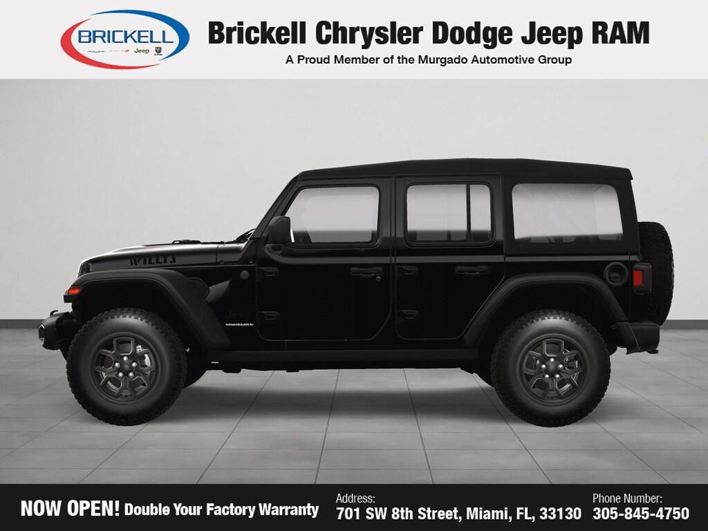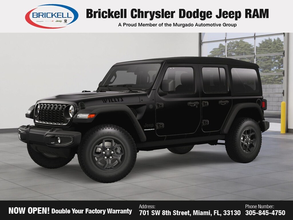 Price includes: $2500 - 2025 National Retail Bonus Cash . Exp. 11/03/2025 $500 - 2025 National 2025 First Responder Bonus Cash. Exp. 01/05/2026 Discover Your Next Vehicle at Brickell Chrysler Dodge Jeep Ram Welcome to Brickell CDJR, where we go beyond selling cars. We double the factory powertrain warranty, giving you added peace of mind. Our dealership offers one of the largest new car inventories in the region, ensuring you find the right vehicle Prices displayed do not included our Perma-plate. Our state-of-the-art service department is the largest in the country and is open seven days a week from 7 AM to 9 PM. Visit us at 701 SW 8th St, Miami, FL 33130, or call 305-777-2800 to learn more and schedule a test drive. The displayed price includes an incentive for financing with Brickell CDJR Finance Company. Outside financing and bank drafts are not accepted. All pre-owned vehicle exports are subject to an export fee. Prices apply only to customers who live, work, or worship in Broward, Miami-Dade, Palm Beach, Monroe, Collier, Hendry, Lee, Glades, Martin, St. Lucie, Okeechobee, Manatee, Hillsborough, Osceola, or Orange County. Customers outside these counties will pay an additional $ Taxes, title, registration, and dealer fees apply. Factory MSRP: $53,280 Black Clearcoat 2025 Jeep Wrangler Willys 4WD 8-Speed Automatic 3.6L V6 24V VVT