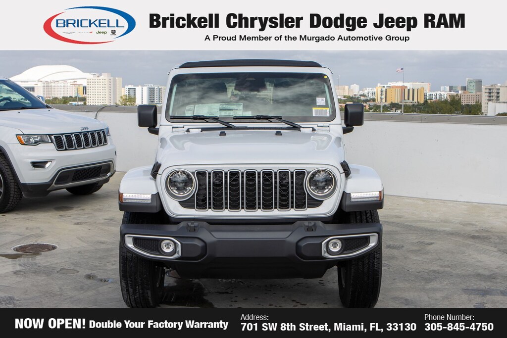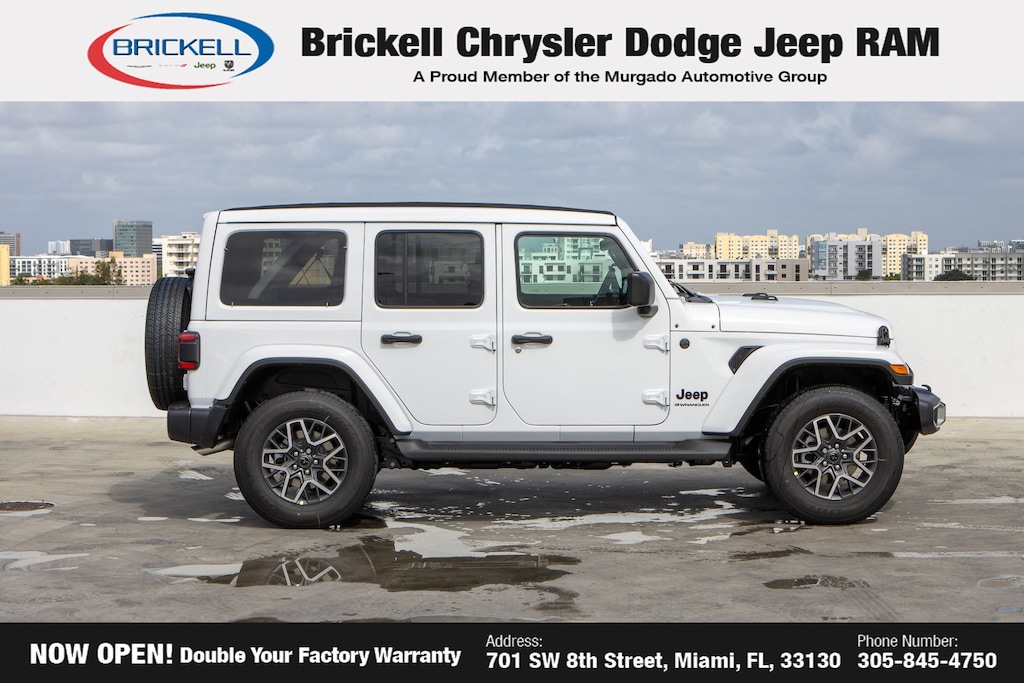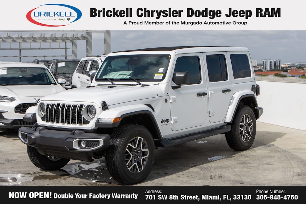 Price includes: $1500 - 2025 National Bonus Cash . Exp. 01/05/2026 $500 - 2025 National 2025 First Responder Bonus Cash. Exp. 01/05/2026 $500 - 2025 National 2025 Military Bonus Cash. Exp. 01/05/2026 Discover Your Next Vehicle at Brickell Chrysler Dodge Jeep Ram Welcome to Brickell CDJR, where we go beyond selling cars. We double the factory powertrain warranty, giving you added peace of mind. Our dealership offers one of the largest new car inventories in the region, ensuring you find the right vehicle Prices displayed do not included our Perma-plate. Our state-of-the-art service department is the largest in the country and is open seven days a week from 7 AM to 9 PM. Visit us at 701 SW 8th St, Miami, FL 33130, or call 305-777-2800 to learn more and schedule a test drive. The displayed price includes an incentive for financing with Brickell CDJR Finance Company. Outside financing and bank drafts are not accepted. All pre-owned vehicle exports are subject to an export fee. Prices apply only to customers who live, work, or worship in Broward, Miami-Dade, Palm Beach, Monroe, Collier, Hendry, Lee, Glades, Martin, St. Lucie, Okeechobee, Manatee, Hillsborough, Osceola, or Orange County. Customers outside these counties will pay an additional $ Taxes, title, registration, and dealer fees apply. Factory MSRP: $57,620 Bright White Clearcoat 2025 Jeep Wrangler Sahara 4WD 8-Speed Automatic 2.0L I4 DOHC