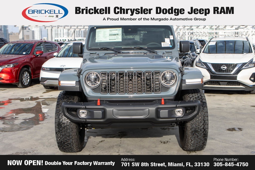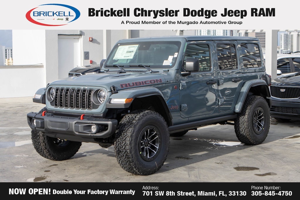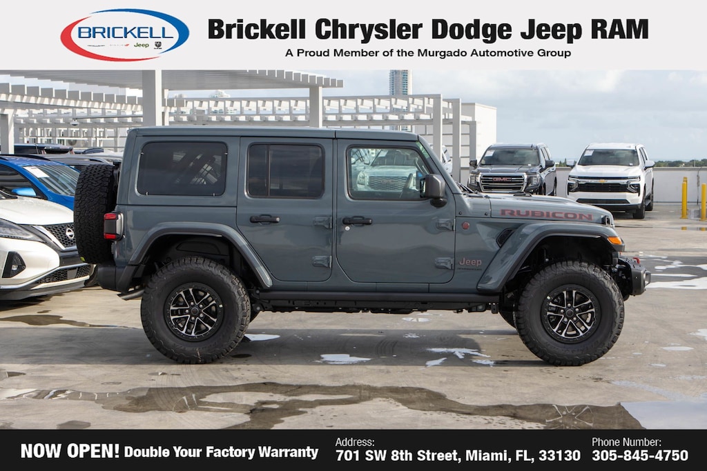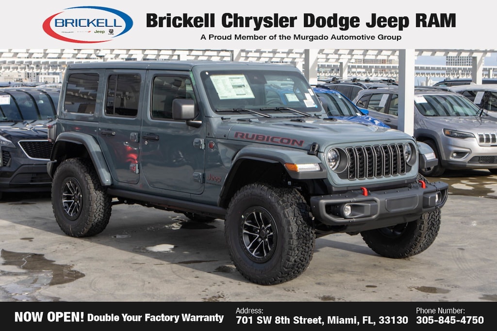 Price includes: $2500 - 2025 National Retail Bonus Cash . Exp. 11/03/2025 $500 - 2025 National 2025 First Responder Bonus Cash. Exp. 01/05/2026 Discover Your Next Vehicle at Brickell Chrysler Dodge Jeep Ram Welcome to Brickell CDJR, where we go beyond selling cars. We double the factory powertrain warranty, giving you added peace of mind. Our dealership offers one of the largest new car inventories in the region, ensuring you find the right vehicle Prices displayed do not included our Perma-plate. Our state-of-the-art service department is the largest in the country and is open seven days a week from 7 AM to 9 PM. Visit us at 701 SW 8th St, Miami, FL 33130, or call 305-777-2800 to learn more and schedule a test drive. The displayed price includes an incentive for financing with Brickell CDJR Finance Company. Outside financing and bank drafts are not accepted. All pre-owned vehicle exports are subject to an export fee. Prices apply only to customers who live, work, or worship in Broward, Miami-Dade, Palm Beach, Monroe, Collier, Hendry, Lee, Glades, Martin, St. Lucie, Okeechobee, Manatee, Hillsborough, Osceola, or Orange County. Customers outside these counties will pay an additional $ Taxes, title, registration, and dealer fees apply. Factory MSRP: $71,760 Anvil Clear Coat 2025 Jeep Wrangler Rubicon X 4WD 8-Speed Automatic 3.6L V6 24V VVT