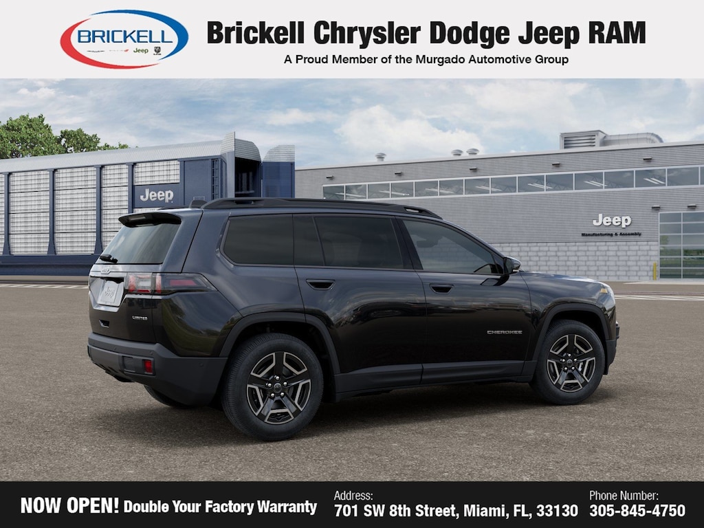 Price includes: $1000 - 2026 National Stellantis Loyalty Bonus Cash . Exp. 03/31/2026 $500 - 2026 National 2026 Military Bonus Cash . Exp. 01/04/2027 Discover Your Next Vehicle at Brickell Chrysler Dodge Jeep Ram Welcome to Brickell CDJR, where we go beyond selling cars. We double the factory powertrain warranty, giving you added peace of mind. Our dealership offers one of the largest new car inventories in the region, ensuring you find the right vehicle Prices displayed do not included our Perma-plate. Our state-of-the-art service department is the largest in the country and is open seven days a week from 7 AM to 9 PM. Visit us at 701 SW 8th St, Miami, FL 33130, or call 305-777-2800 to learn more and schedule a test drive. The displayed price includes an incentive for financing with Brickell CDJR Finance Company. Outside financing and bank drafts are not accepted. All pre-owned vehicle exports are subject to an export fee. Prices apply only to customers who live, work, or worship in Broward, Miami-Dade, Palm Beach, Monroe, Collier, Hendry, Lee, Glades, Martin, St. Lucie, Okeechobee, Manatee, Hillsborough, Osceola, or Orange County. Customers outside these counties will pay an additional $ Taxes, title, registration, and dealer fees apply. Factory MSRP: $43,585 Diamond Black Crystal Pearlcoat 2026 Jeep Cherokee Limited 4WD CVT 1.6L I4 1.6L I4.