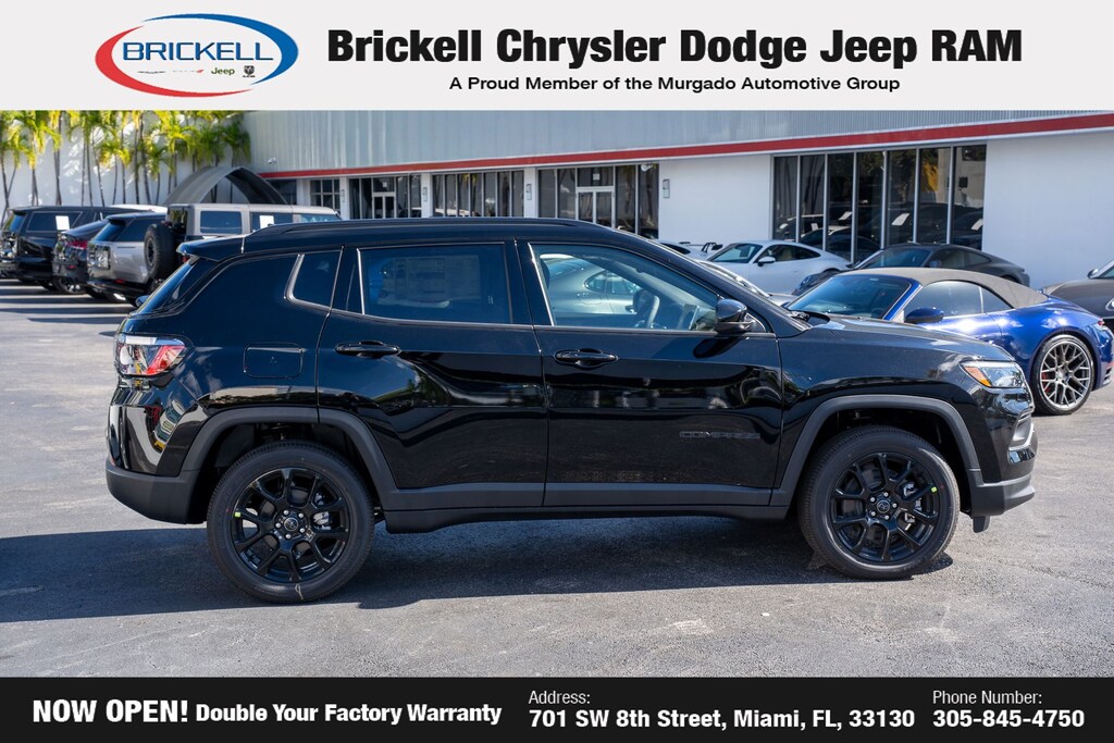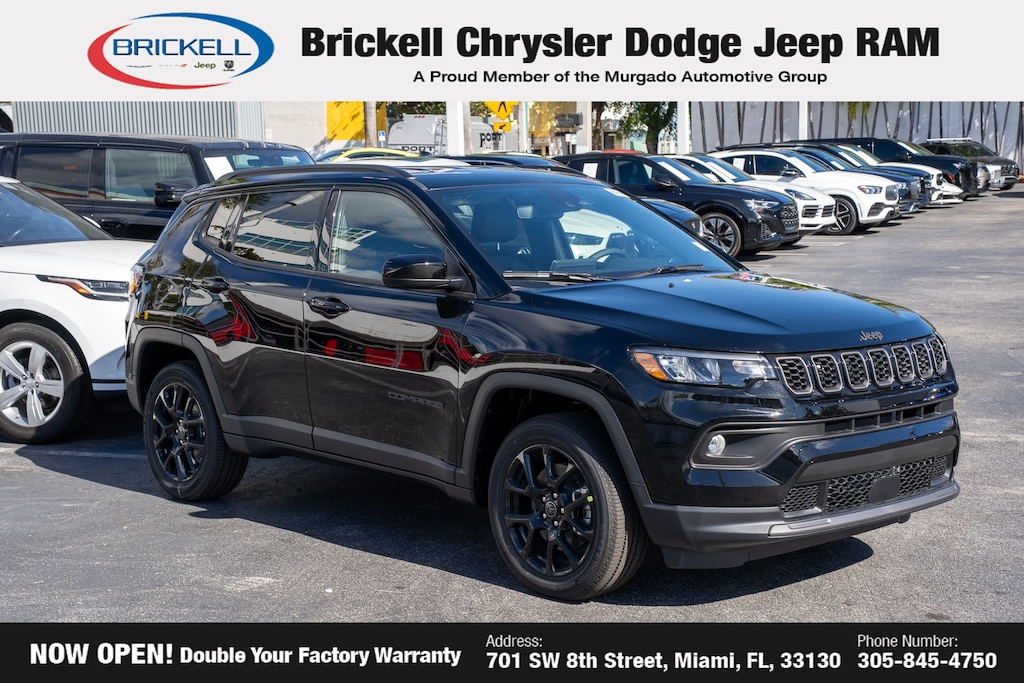 Price includes: $1000 - 2026 National Retail Bonus Cash . Exp. 02/02/2026 $1000 - 2026 South BC Loyalty Retail Bonus Cash. Exp. 01/20/2026 $1000 - 2026 South BC Retail Bonus Cash . Exp. 01/20/2026 $1500 - 2026 National Stellantis Loyalty Retail Bonus Cash . Exp. 02/02/2026 Discover Your Next Vehicle at Brickell Chrysler Dodge Jeep Ram Welcome to Brickell CDJR, where we go beyond selling cars. We double the factory powertrain warranty, giving you added peace of mind. Our dealership offers one of the largest new car inventories in the region, ensuring you find the right vehicle Prices displayed do not included our Perma-plate. Our state-of-the-art service department is the largest in the country and is open seven days a week from 7 AM to 9 PM. Visit us at 701 SW 8th St, Miami, FL 33130, or call 305-777-2800 to learn more and schedule a test drive. The displayed price includes an incentive for financing with Brickell CDJR Finance Company. Outside financing and bank drafts are not accepted. All pre-owned vehicle exports are subject to an export fee. Prices apply only to customers who live, work, or worship in Broward, Miami-Dade, Palm Beach, Monroe, Collier, Hendry, Lee, Glades, Martin, St. Lucie, Okeechobee, Manatee, Hillsborough, Osceola, or Orange County. Customers outside these counties will pay an additional $ Taxes, title, registration, and dealer fees apply. Factory MSRP: $33,580 Diamond Black Crystal Pearlcoat 2026 Jeep Compass Latitude 4WD 8-Speed Automatic 2.0L I4 DOHC 4WD.