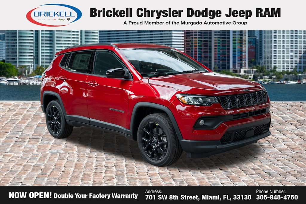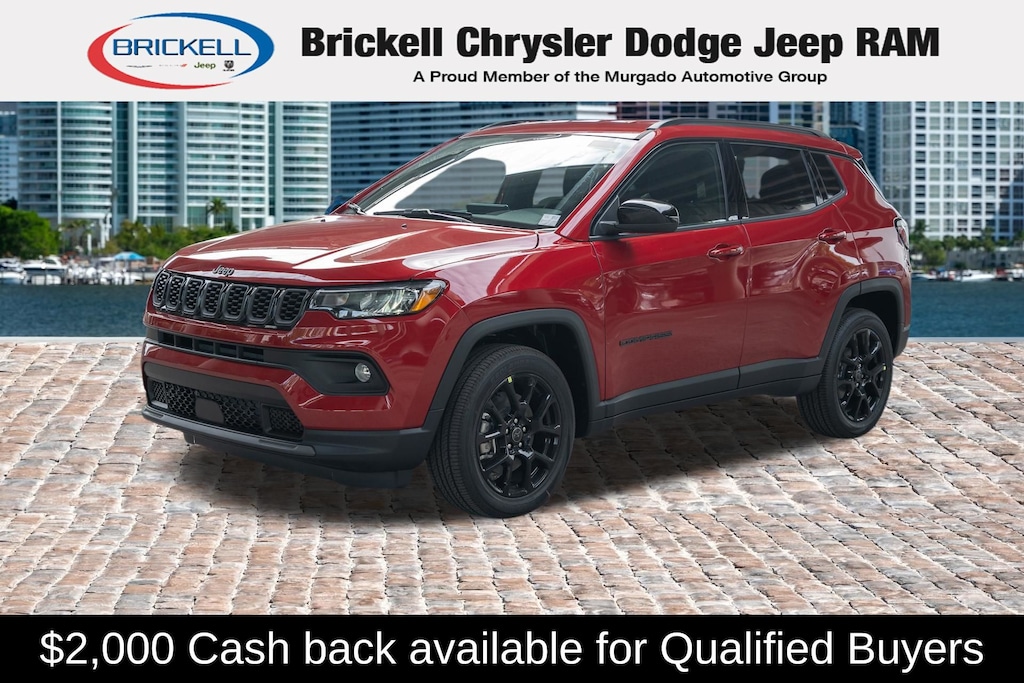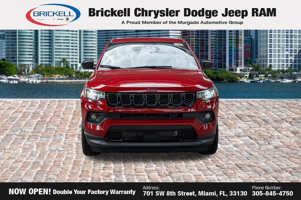 Price includes: $1000 - 2026 National Retail Bonus Cash . Exp. 04/30/2026 $1000 - 2026 Southeast BC Retail Bonus Cash. Exp. 04/30/2026 Discover Your Next Vehicle at Brickell Chrysler Dodge Jeep Ram Welcome to Brickell CDJR, where we go beyond selling cars. We double the factory powertrain warranty, giving you added peace of mind. Our dealership offers one of the largest new car inventories in the region, ensuring you find the right vehicle Prices displayed do not included our Perma-plate. Our state-of-the-art service department is the largest in the country and is open seven days a week from 7 AM to 9 PM. Visit us at 701 SW 8th St, Miami, FL 33130, or call 305-777-2800 to learn more and schedule a test drive. The displayed price includes an incentive for financing with Brickell CDJR Finance Company. Outside financing and bank drafts are not accepted. All pre-owned vehicle exports are subject to an export fee. Prices apply only to customers who live, work, or worship in Broward, Miami-Dade, Palm Beach, Monroe, Collier, Hendry, Lee, Glades, Martin, St. Lucie, Okeechobee, Manatee, Hillsborough, Osceola, or Orange County. Customers outside these counties will pay an additional $ Taxes, title, registration, and dealer fees apply. Factory MSRP: $33,210 red hot pearlcoat 2026 Jeep Compass Latitude 4WD 8-Speed Automatic 2.0L I4 DOHC 4WD.