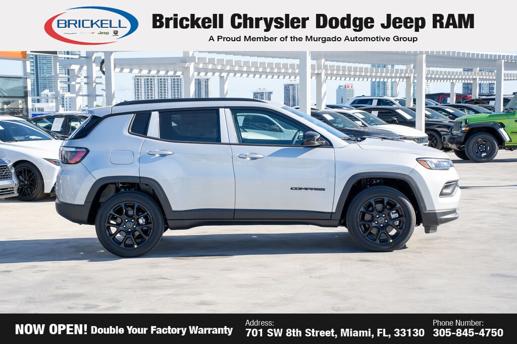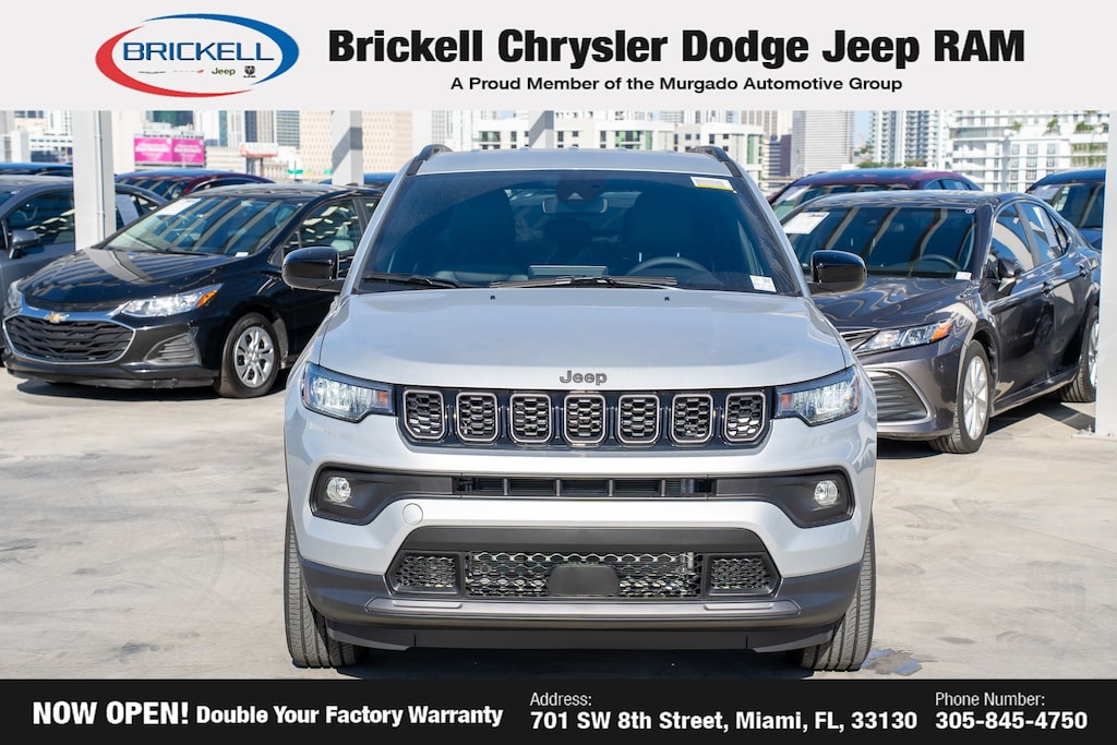Price includes: $1000 - 2026 National Retail Bonus Cash . Exp. 12/01/2025 Discover Your Next Vehicle at Brickell Chrysler Dodge Jeep Ram Welcome to Brickell CDJR, where we go beyond selling cars. We double the factory powertrain warranty, giving you added peace of mind. Our dealership offers one of the largest new car inventories in the region, ensuring you find the right vehicle Prices displayed do not included our Perma-plate. Our state-of-the-art service department is the largest in the country and is open seven days a week from 7 AM to 9 PM. Visit us at 701 SW 8th St, Miami, FL 33130, or call 305-777-2800 to learn more and schedule a test drive. The displayed price includes an incentive for financing with Brickell CDJR Finance Company. Outside financing and bank drafts are not accepted. All pre-owned vehicle exports are subject to an export fee. Prices apply only to customers who live, work, or worship in Broward, Miami-Dade, Palm Beach, Monroe, Collier, Hendry, Lee, Glades, Martin, St. Lucie, Okeechobee, Manatee, Hillsborough, Osceola, or Orange County. Customers outside these counties will pay an additional $ Taxes, title, registration, and dealer fees apply. Factory MSRP: $33,410 Silver Zynith Metallic Clearcoat 2026 Jeep Compass Latitude 4WD 8-Speed Automatic 2.0L I4 DOHC 4WD.