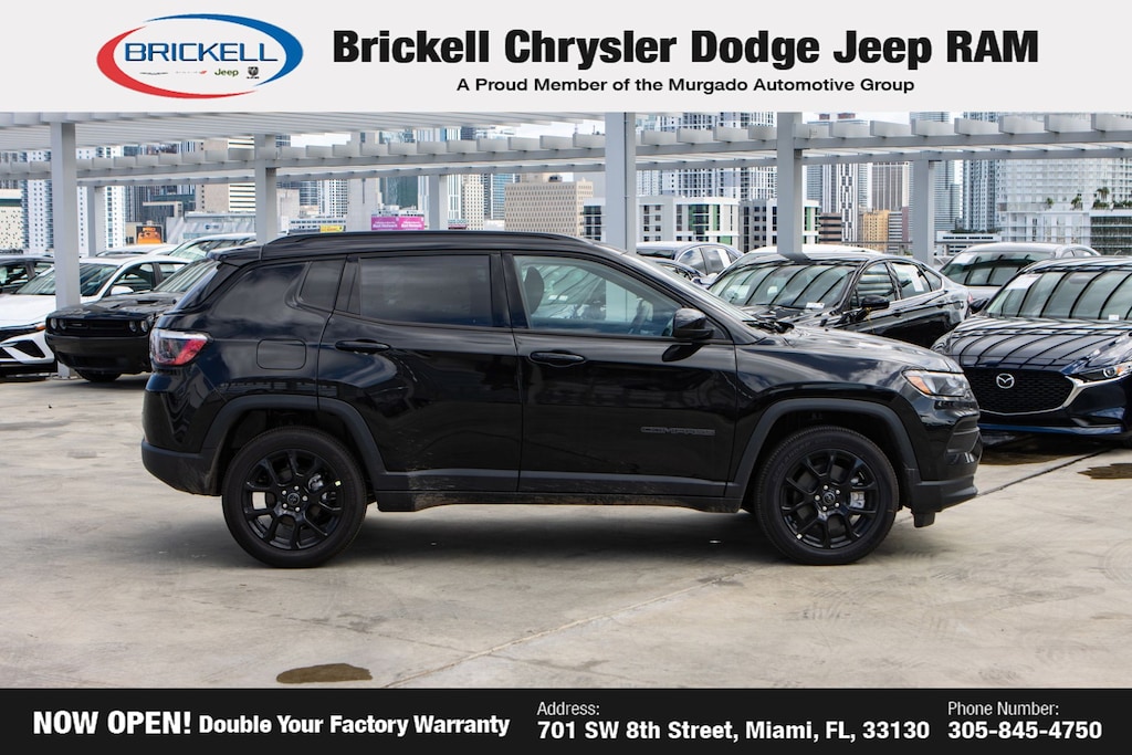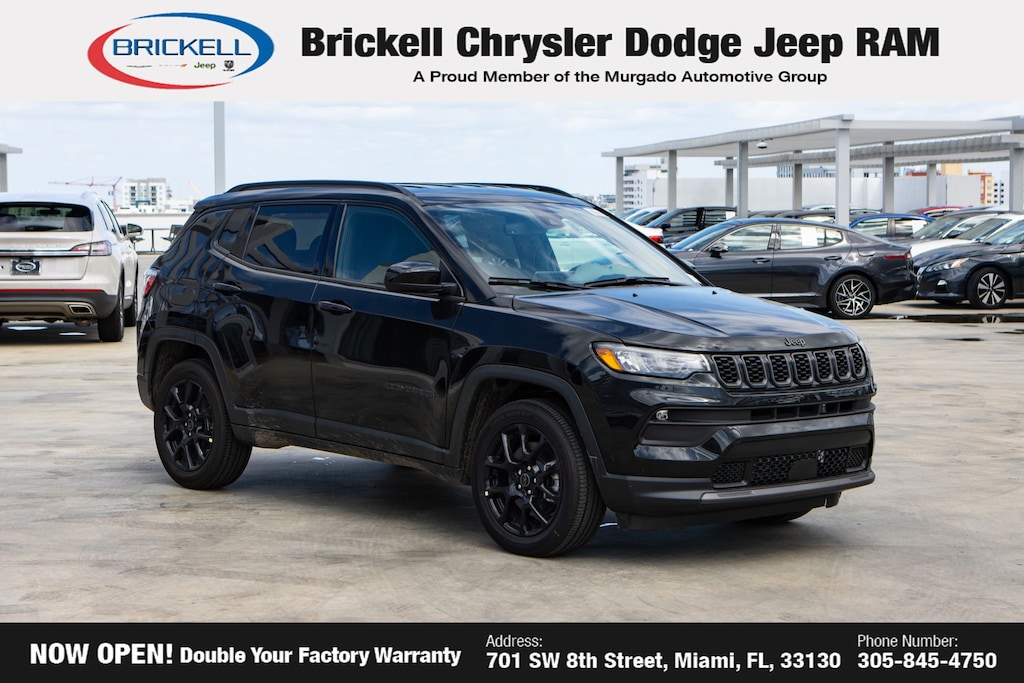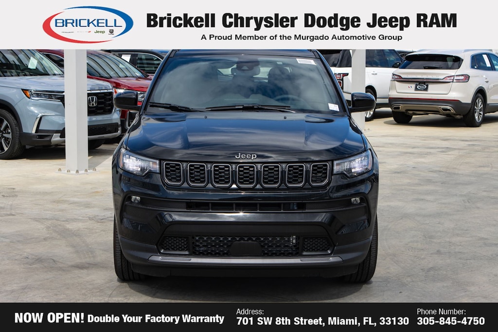 Price includes: $1000 - 2026 National Retail Bonus Cash . Exp. 12/01/2025 $1960 - 2026 National Select Inventory Bonus Cash w/ 4TR . Exp. 01/05/2026 Discover Your Next Vehicle at Brickell Chrysler Dodge Jeep Ram Welcome to Brickell CDJR, where we go beyond selling cars. We double the factory powertrain warranty, giving you added peace of mind. Our dealership offers one of the largest new car inventories in the region, ensuring you find the right vehicle Prices displayed do not included our Perma-plate. Our state-of-the-art service department is the largest in the country and is open seven days a week from 7 AM to 9 PM. Visit us at 701 SW 8th St, Miami, FL 33130, or call 305-777-2800 to learn more and schedule a test drive. The displayed price includes an incentive for financing with Brickell CDJR Finance Company. Outside financing and bank drafts are not accepted. All pre-owned vehicle exports are subject to an export fee. Prices apply only to customers who live, work, or worship in Broward, Miami-Dade, Palm Beach, Monroe, Collier, Hendry, Lee, Glades, Martin, St. Lucie, Okeechobee, Manatee, Hillsborough, Osceola, or Orange County. Customers outside these counties will pay an additional $ Taxes, title, registration, and dealer fees apply. Factory MSRP: $38,335 Diamond Black Crystal Pearlcoat 2026 Jeep Compass Latitude 4WD 8-Speed Automatic 2.0L I4 DOHC 4WD.