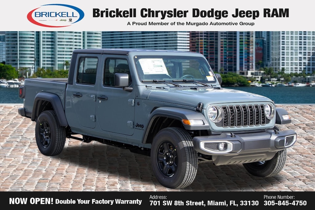 Price includes: $1000 - 2026 National Retail Bonus Cash . Exp. 04/30/2026 Discover Your Next Vehicle at Brickell Chrysler Dodge Jeep Ram Welcome to Brickell CDJR, where we go beyond selling cars. We double the factory powertrain warranty, giving you added peace of mind. Our dealership offers one of the largest new car inventories in the region, ensuring you find the right vehicle Prices displayed do not included our Perma-plate. Our state-of-the-art service department is the largest in the country and is open seven days a week from 7 AM to 9 PM. Visit us at 701 SW 8th St, Miami, FL 33130, or call 305-777-2800 to learn more and schedule a test drive. The displayed price includes an incentive for financing with Brickell CDJR Finance Company. Outside financing and bank drafts are not accepted. All pre-owned vehicle exports are subject to an export fee. Prices apply only to customers who live, work, or worship in Broward, Miami-Dade, Palm Beach, Monroe, Collier, Hendry, Lee, Glades, Martin, St. Lucie, Okeechobee, Manatee, Hillsborough, Osceola, or Orange County. Customers outside these counties will pay an additional $ Taxes, title, registration, and dealer fees apply. Factory MSRP: $44,040 Anvil Clearcoat 2026 Jeep Gladiator Sport 4WD 8-Speed Automatic 3.6L V6 24V VVT