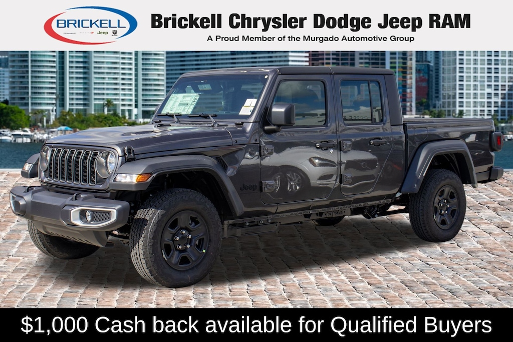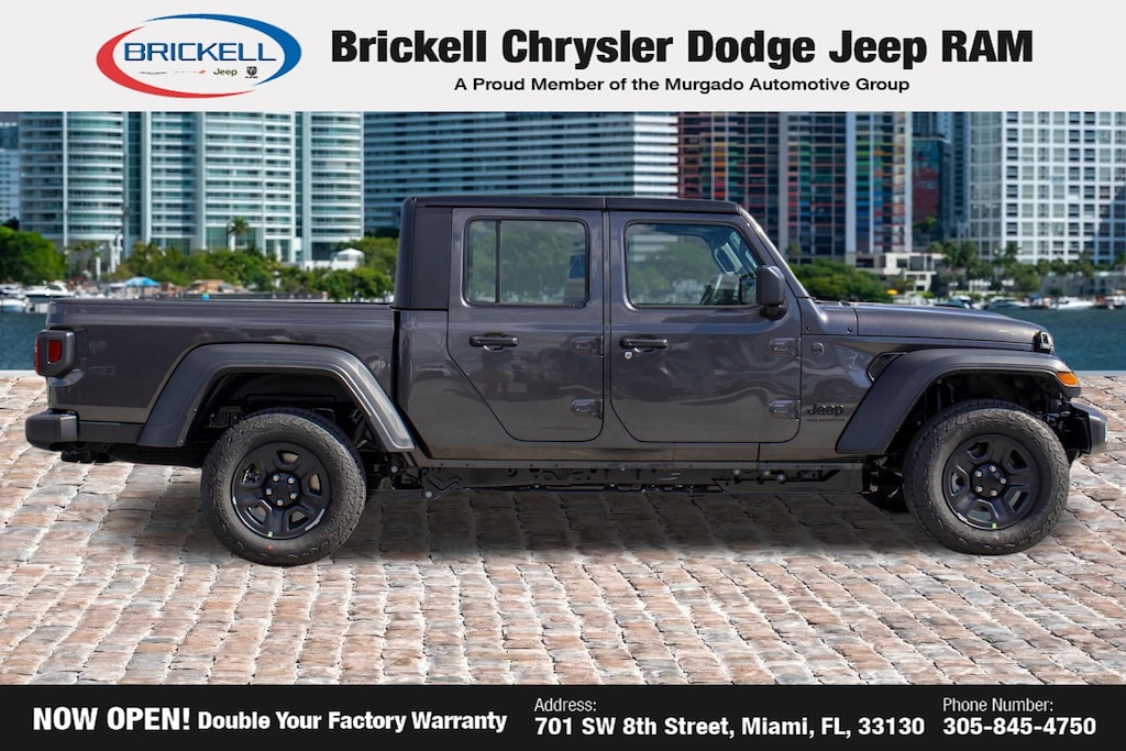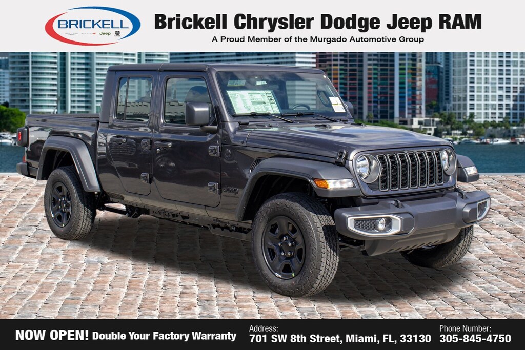 Price includes: $1000 - 2026 National Retail Bonus Cash . Exp. 04/30/2026 Discover Your Next Vehicle at Brickell Chrysler Dodge Jeep Ram Welcome to Brickell CDJR, where we go beyond selling cars. We double the factory powertrain warranty, giving you added peace of mind. Our dealership offers one of the largest new car inventories in the region, ensuring you find the right vehicle Prices displayed do not included our Perma-plate. Our state-of-the-art service department is the largest in the country and is open seven days a week from 7 AM to 9 PM. Visit us at 701 SW 8th St, Miami, FL 33130, or call 305-777-2800 to learn more and schedule a test drive. The displayed price includes an incentive for financing with Brickell CDJR Finance Company. Outside financing and bank drafts are not accepted. All pre-owned vehicle exports are subject to an export fee. Prices apply only to customers who live, work, or worship in Broward, Miami-Dade, Palm Beach, Monroe, Collier, Hendry, Lee, Glades, Martin, St. Lucie, Okeechobee, Manatee, Hillsborough, Osceola, or Orange County. Customers outside these counties will pay an additional $ Taxes, title, registration, and dealer fees apply. Factory MSRP: $46,035 Granite Crystal Metallic Clearcoat 2026 Jeep Gladiator Sport 4WD 8-Speed Automatic 3.6L V6 24V VVT