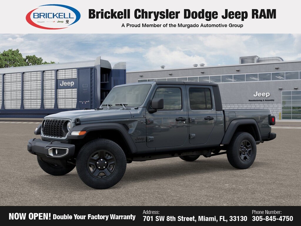 Price includes: $1500 - 2026 National Stellantis Loyalty Retail Bonus Cash . Exp. 01/05/2026 $500 - 2026 National 2026 Military Bonus Cash . Exp. 01/05/2026 Discover Your Next Vehicle at Brickell Chrysler Dodge Jeep Ram Welcome to Brickell CDJR, where we go beyond selling cars. We double the factory powertrain warranty, giving you added peace of mind. Our dealership offers one of the largest new car inventories in the region, ensuring you find the right vehicle Prices displayed do not included our Perma-plate. Our state-of-the-art service department is the largest in the country and is open seven days a week from 7 AM to 9 PM. Visit us at 701 SW 8th St, Miami, FL 33130, or call 305-777-2800 to learn more and schedule a test drive. The displayed price includes an incentive for financing with Brickell CDJR Finance Company. Outside financing and bank drafts are not accepted. All pre-owned vehicle exports are subject to an export fee. Prices apply only to customers who live, work, or worship in Broward, Miami-Dade, Palm Beach, Monroe, Collier, Hendry, Lee, Glades, Martin, St. Lucie, Okeechobee, Manatee, Hillsborough, Osceola, or Orange County. Customers outside these counties will pay an additional $ Taxes, title, registration, and dealer fees apply. Factory MSRP: $45,040 Anvil Clear Coat 2026 Jeep Gladiator Sport 4WD 8-Speed Automatic 3.6L V6 24V VVT