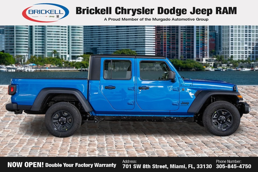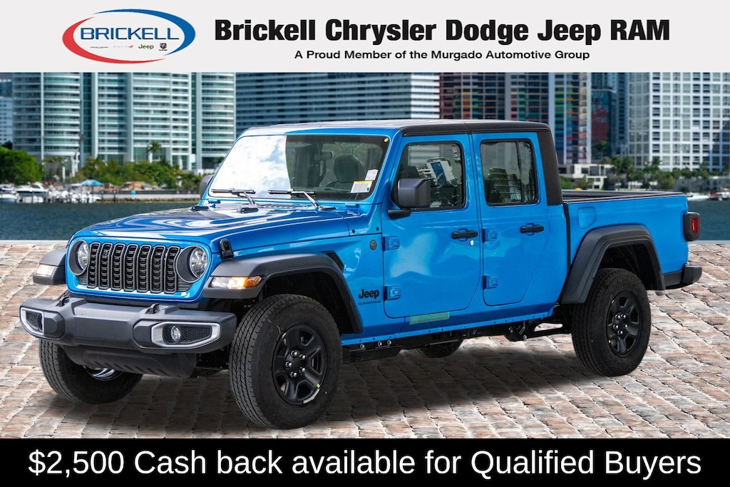 Price includes: $1000 - 2026 National Retail Bonus Cash . Exp. 04/30/2026 Discover Your Next Vehicle at Brickell Chrysler Dodge Jeep Ram Welcome to Brickell CDJR, where we go beyond selling cars. We double the factory powertrain warranty, giving you added peace of mind. Our dealership offers one of the largest new car inventories in the region, ensuring you find the right vehicle Prices displayed do not included our Perma-plate. Our state-of-the-art service department is the largest in the country and is open seven days a week from 7 AM to 9 PM. Visit us at 701 SW 8th St, Miami, FL 33130, or call 305-777-2800 to learn more and schedule a test drive. The displayed price includes an incentive for financing with Brickell CDJR Finance Company. Outside financing and bank drafts are not accepted. All pre-owned vehicle exports are subject to an export fee. Prices apply only to customers who live, work, or worship in Broward, Miami-Dade, Palm Beach, Monroe, Collier, Hendry, Lee, Glades, Martin, St. Lucie, Okeechobee, Manatee, Hillsborough, Osceola, or Orange County. Customers outside these counties will pay an additional $ Taxes, title, registration, and dealer fees apply. Factory MSRP: $45,440 Hydro Blue Pearlcoat 2026 Jeep Gladiator Sport 4WD 8-Speed Automatic 3.6L V6 24V VVT