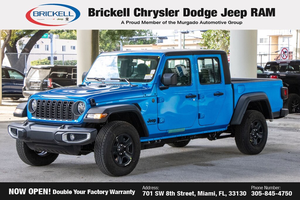 Price includes: $1500 - 2026 National Stellantis Loyalty Retail Bonus Cash . Exp. 02/02/2026 Discover Your Next Vehicle at Brickell Chrysler Dodge Jeep Ram Welcome to Brickell CDJR, where we go beyond selling cars. We double the factory powertrain warranty, giving you added peace of mind. Our dealership offers one of the largest new car inventories in the region, ensuring you find the right vehicle Prices displayed do not included our Perma-plate. Our state-of-the-art service department is the largest in the country and is open seven days a week from 7 AM to 9 PM. Visit us at 701 SW 8th St, Miami, FL 33130, or call 305-777-2800 to learn more and schedule a test drive. The displayed price includes an incentive for financing with Brickell CDJR Finance Company. Outside financing and bank drafts are not accepted. All pre-owned vehicle exports are subject to an export fee. Prices apply only to customers who live, work, or worship in Broward, Miami-Dade, Palm Beach, Monroe, Collier, Hendry, Lee, Glades, Martin, St. Lucie, Okeechobee, Manatee, Hillsborough, Osceola, or Orange County. Customers outside these counties will pay an additional $ Taxes, title, registration, and dealer fees apply. Factory MSRP: $45,440 Hydro Blue Pearlcoat 2026 Jeep Gladiator Sport 4WD 8-Speed Automatic 3.6L V6 24V VVT