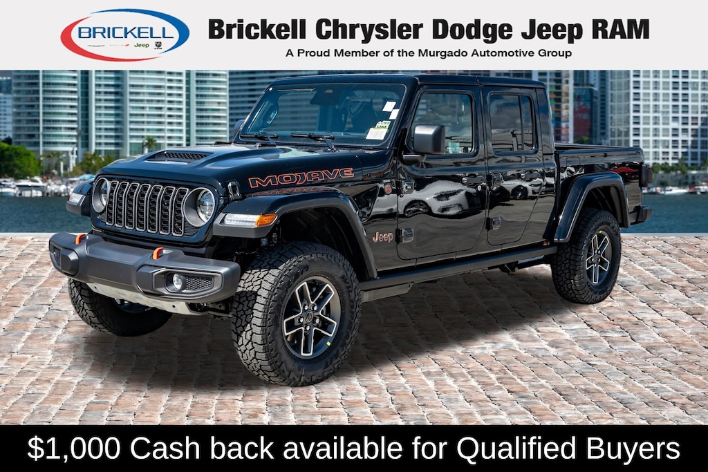 Price includes: $1000 - 2026 National Retail Bonus Cash . Exp. 04/30/2026 Discover Your Next Vehicle at Brickell Chrysler Dodge Jeep Ram Welcome to Brickell CDJR, where we go beyond selling cars. We double the factory powertrain warranty, giving you added peace of mind. Our dealership offers one of the largest new car inventories in the region, ensuring you find the right vehicle Prices displayed do not included our Perma-plate. Our state-of-the-art service department is the largest in the country and is open seven days a week from 7 AM to 9 PM. Visit us at 701 SW 8th St, Miami, FL 33130, or call 305-777-2800 to learn more and schedule a test drive. The displayed price includes an incentive for financing with Brickell CDJR Finance Company. Outside financing and bank drafts are not accepted. All pre-owned vehicle exports are subject to an export fee. Prices apply only to customers who live, work, or worship in Broward, Miami-Dade, Palm Beach, Monroe, Collier, Hendry, Lee, Glades, Martin, St. Lucie, Okeechobee, Manatee, Hillsborough, Osceola, or Orange County. Customers outside these counties will pay an additional $ Taxes, title, registration, and dealer fees apply. Factory MSRP: $45,035 Granite Crystal Metallic Clearcoat 2026 Jeep Gladiator Sport 4WD 8-Speed Automatic 3.6L V6 24V VVT