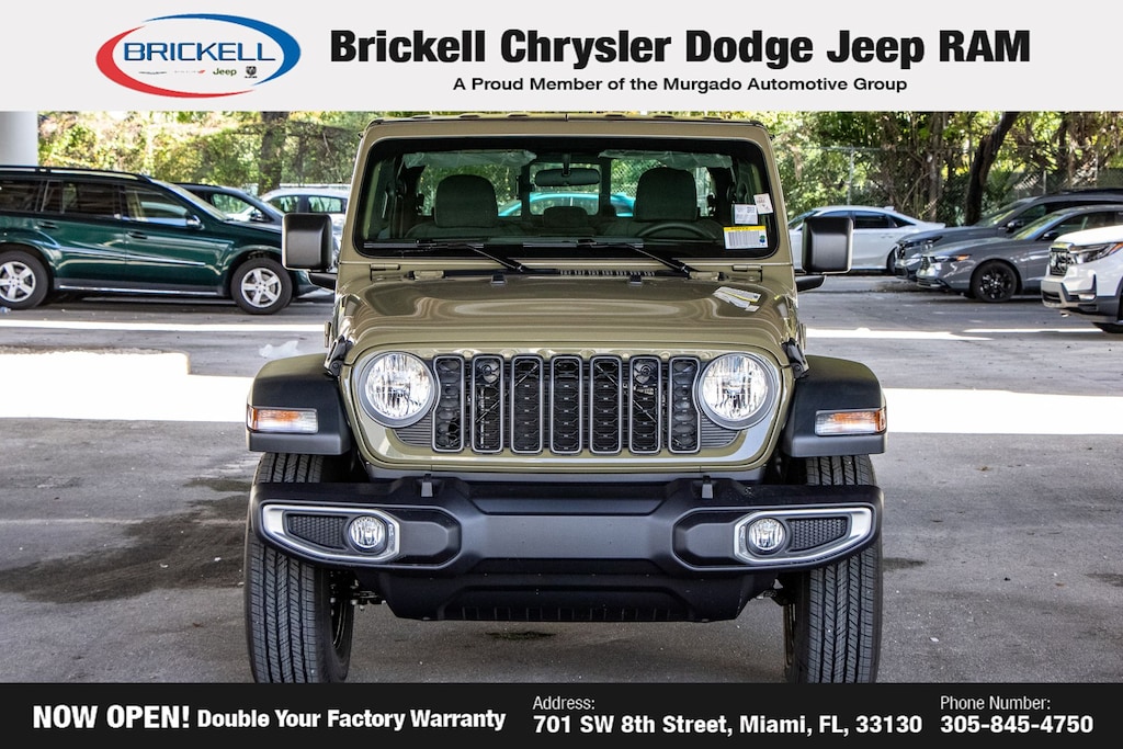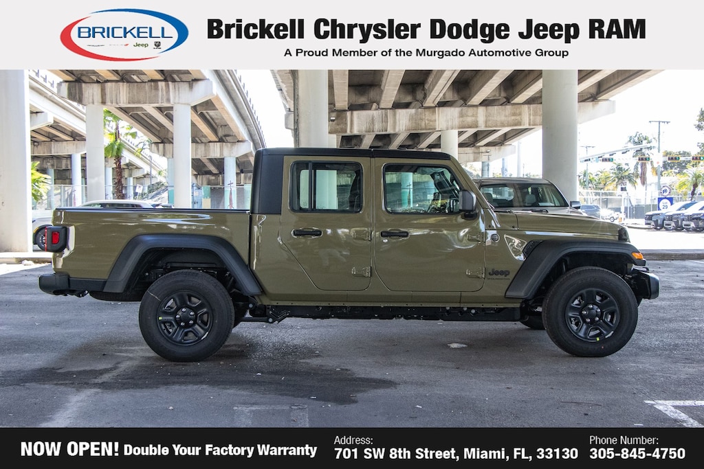 Price includes: $500 - 2026 National 2026 Military Bonus Cash . Exp. 01/04/2027 Discover Your Next Vehicle at Brickell Chrysler Dodge Jeep Ram Welcome to Brickell CDJR, where we go beyond selling cars. We double the factory powertrain warranty, giving you added peace of mind. Our dealership offers one of the largest new car inventories in the region, ensuring you find the right vehicle Prices displayed do not included our Perma-plate. Our state-of-the-art service department is the largest in the country and is open seven days a week from 7 AM to 9 PM. Visit us at 701 SW 8th St, Miami, FL 33130, or call 305-777-2800 to learn more and schedule a test drive. The displayed price includes an incentive for financing with Brickell CDJR Finance Company. Outside financing and bank drafts are not accepted. All pre-owned vehicle exports are subject to an export fee. Prices apply only to customers who live, work, or worship in Broward, Miami-Dade, Palm Beach, Monroe, Collier, Hendry, Lee, Glades, Martin, St. Lucie, Okeechobee, Manatee, Hillsborough, Osceola, or Orange County. Customers outside these counties will pay an additional $ Taxes, title, registration, and dealer fees apply. Factory MSRP: $44,040 41 2026 Jeep Gladiator Sport 4WD 8-Speed Automatic 3.6L V6 24V VVT