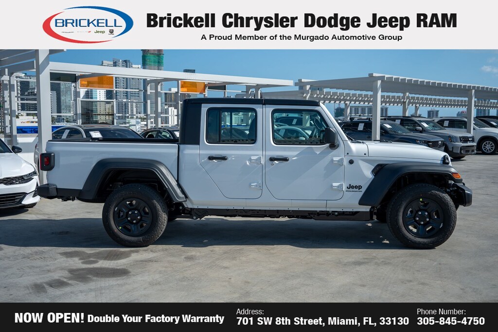 Price includes: $1000 - 2026 National Retail Bonus Cash . Exp. 03/31/2026 $1000 - 2026 National Stellantis Loyalty Bonus Cash . Exp. 03/31/2026 $500 - 2026 National 2026 Military Bonus Cash . Exp. 01/04/2027 Discover Your Next Vehicle at Brickell Chrysler Dodge Jeep Ram Welcome to Brickell CDJR, where we go beyond selling cars. We double the factory powertrain warranty, giving you added peace of mind. Our dealership offers one of the largest new car inventories in the region, ensuring you find the right vehicle Prices displayed do not included our Perma-plate. Our state-of-the-art service department is the largest in the country and is open seven days a week from 7 AM to 9 PM. Visit us at 701 SW 8th St, Miami, FL 33130, or call 305-777-2800 to learn more and schedule a test drive. The displayed price includes an incentive for financing with Brickell CDJR Finance Company. Outside financing and bank drafts are not accepted. All pre-owned vehicle exports are subject to an export fee. Prices apply only to customers who live, work, or worship in Broward, Miami-Dade, Palm Beach, Monroe, Collier, Hendry, Lee, Glades, Martin, St. Lucie, Okeechobee, Manatee, Hillsborough, Osceola, or Orange County. Customers outside these counties will pay an additional $ Taxes, title, registration, and dealer fees apply. Factory MSRP: $45,440 Bright White Clearcoat 2026 Jeep Gladiator Sport 4WD 8-Speed Automatic 3.6L V6 24V VVT